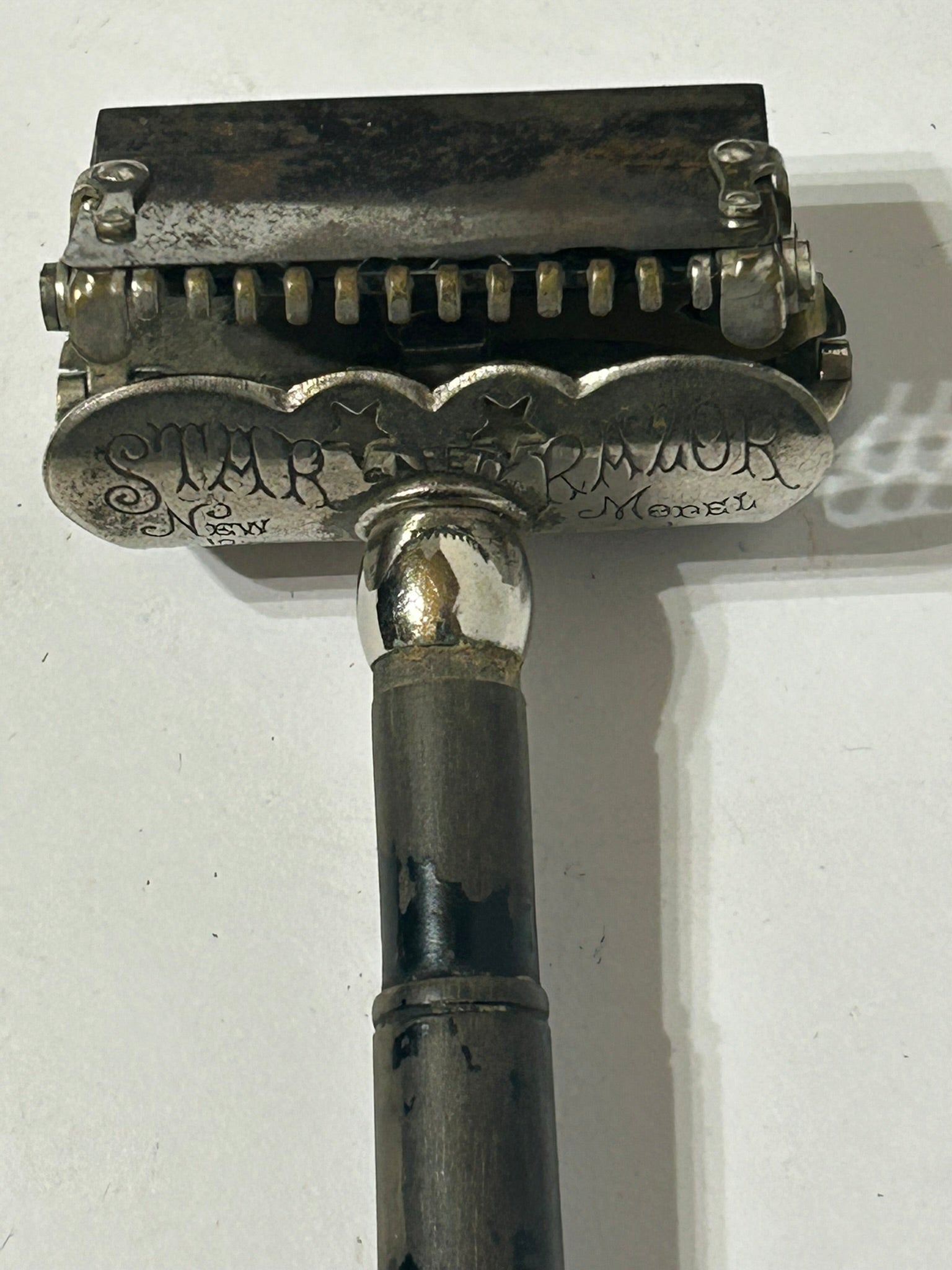 STAR ANTIQUE BOXED RAZOR WITH RARE STAR SHARPENER IN ORIGINAL BOX 7 1/2" X 5" AND SHARPENER IS 6" LONG. CALL OR TEXT FOR MORE INFORMATION