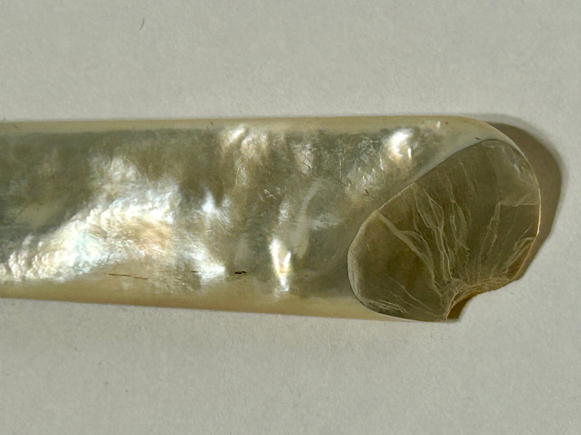 ANTIQUE STERLING AND MOTHER OF PEARL HANDLED SIX KNIVES AND SIX FORKS - KNIVES ARE 9" LONG NOTE ONE KNIFE HAS LARGE CHIP ON HANDLE END. SHIPPING IS EXTRA SO CALL OR TEXT TO FIND OUT HOW MUCH SHIPPING WILL COST