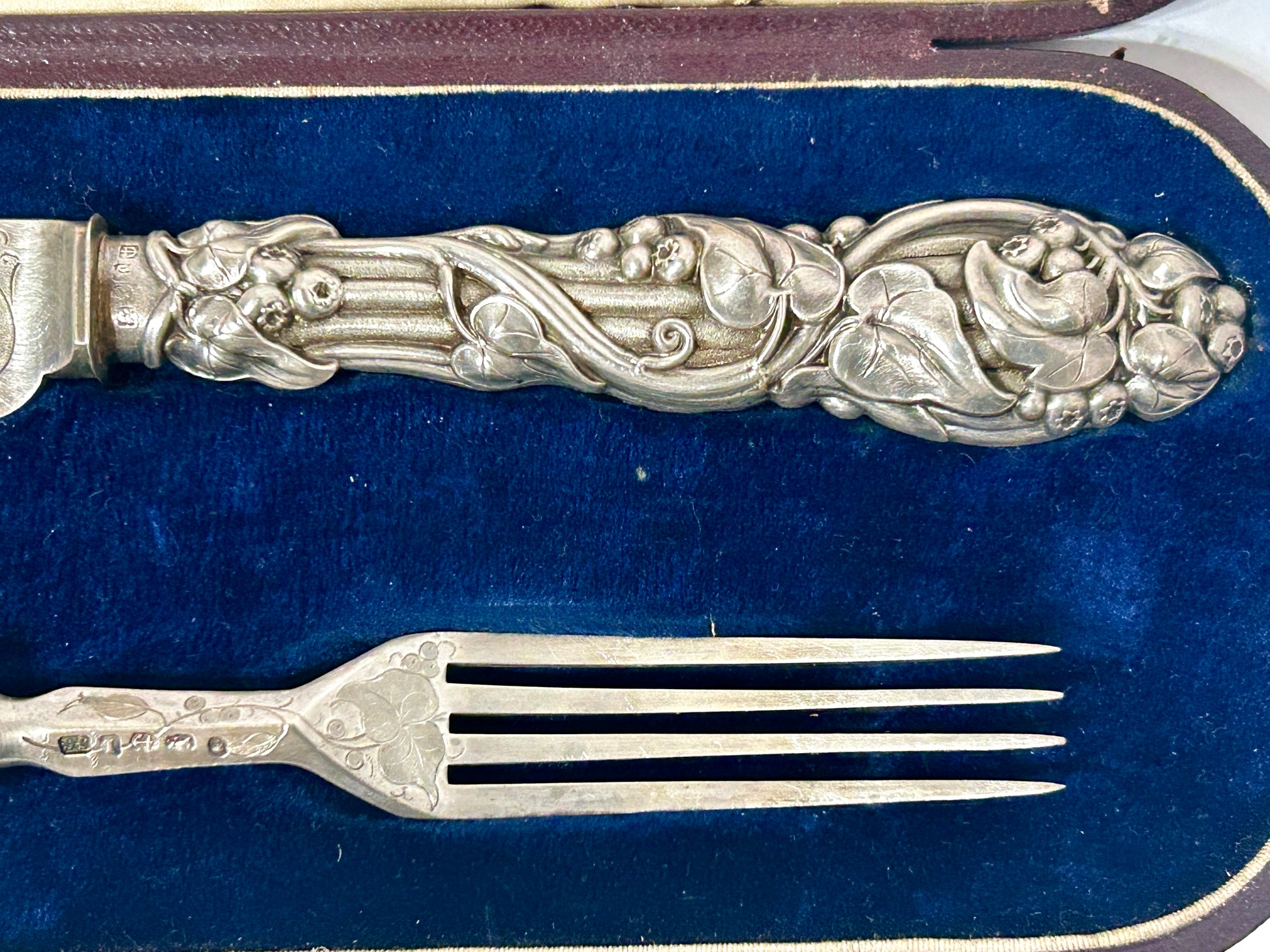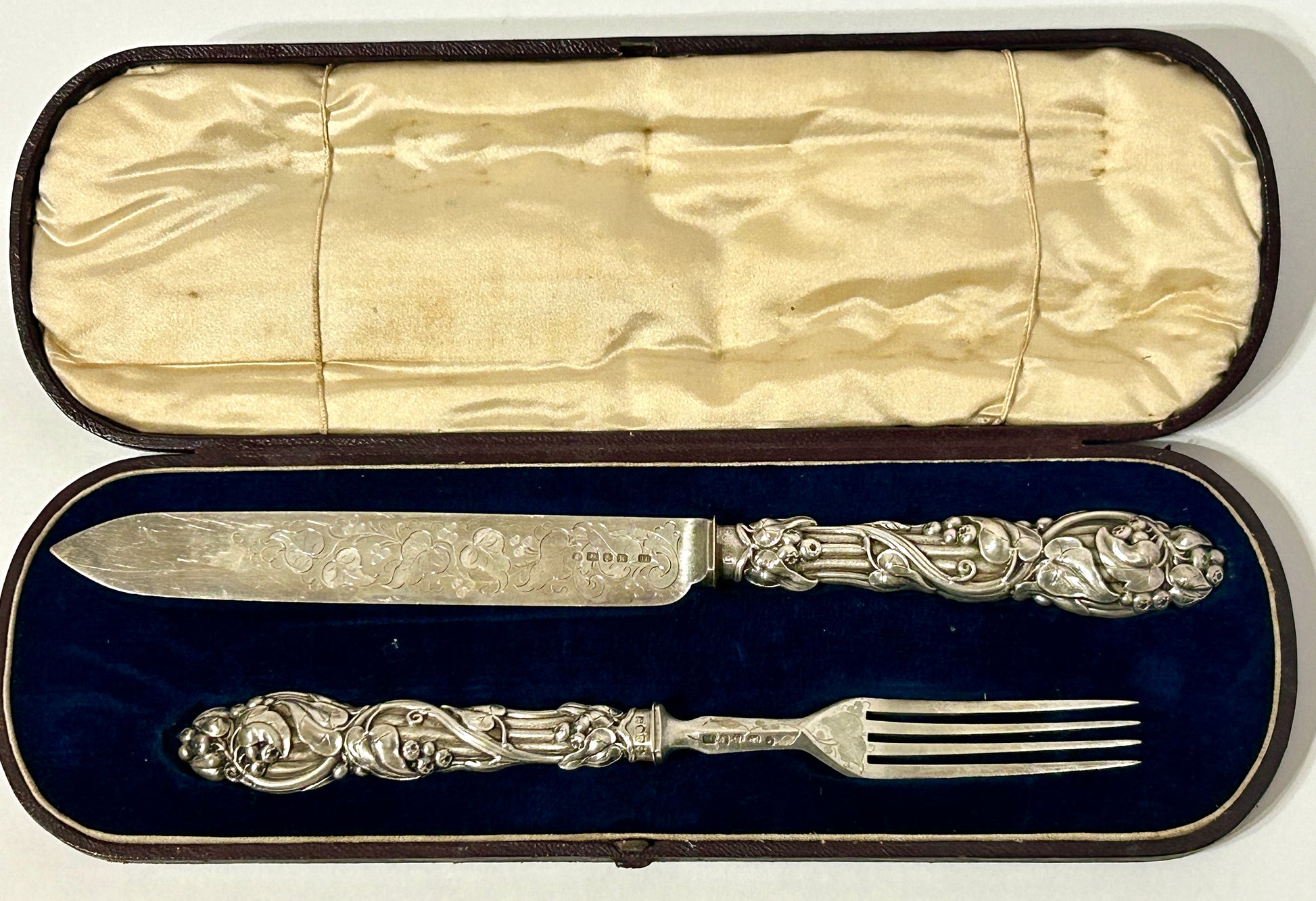 ANTIQUE STERLING SILVER CIRCA 1860 FISH SET BY JOHN GILBERT, BIRMINGHAM ENGLAND, KNIFE 12" IN ORIGINAL CASE. SHIPPING CHARGE IS EXTRA SO PLEASE CALL OR TEXT SO WE CAN GIVE YOU THE SHIPPING CHARGE TO YOUR ADDRESS
