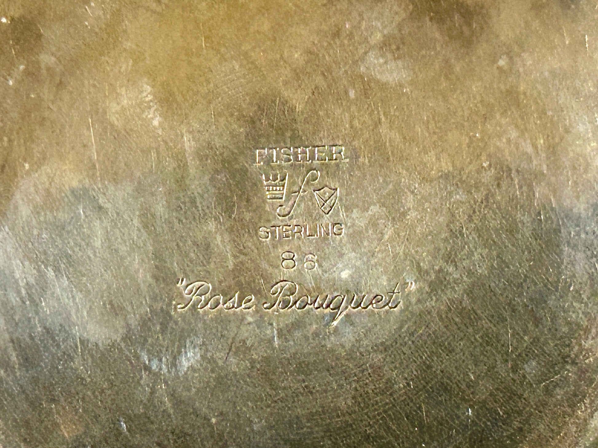 STERLING SILVER TUMBLER WITH ROSE BOUQUET PATTERN BY FISHER 88 GRAMS AND 3 1/8" TALL BY 3 1/8" DIAMETER. SHIPPING IS EXTRA SO CALL OR TEXT TO FIND OUT COST TO SHIP TO YOUR ADDRESS