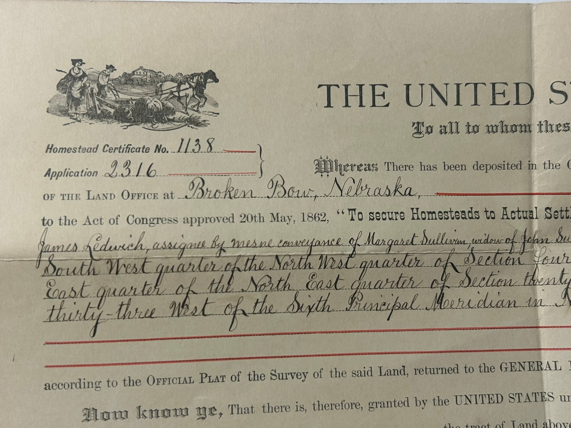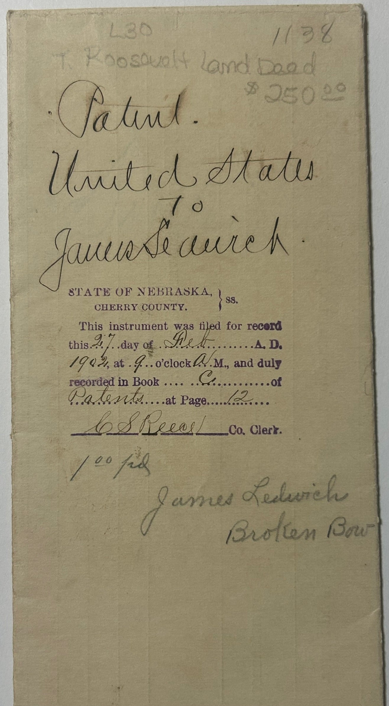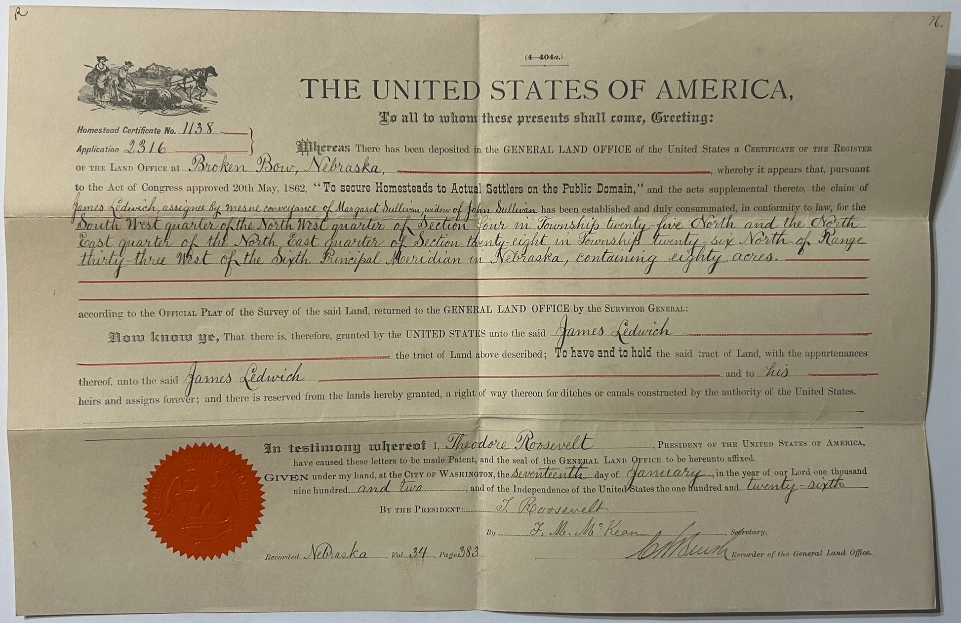 TEDDY ROOSEVELT 1902 LAND DOCUMENT FOR NEBRASKA LAND