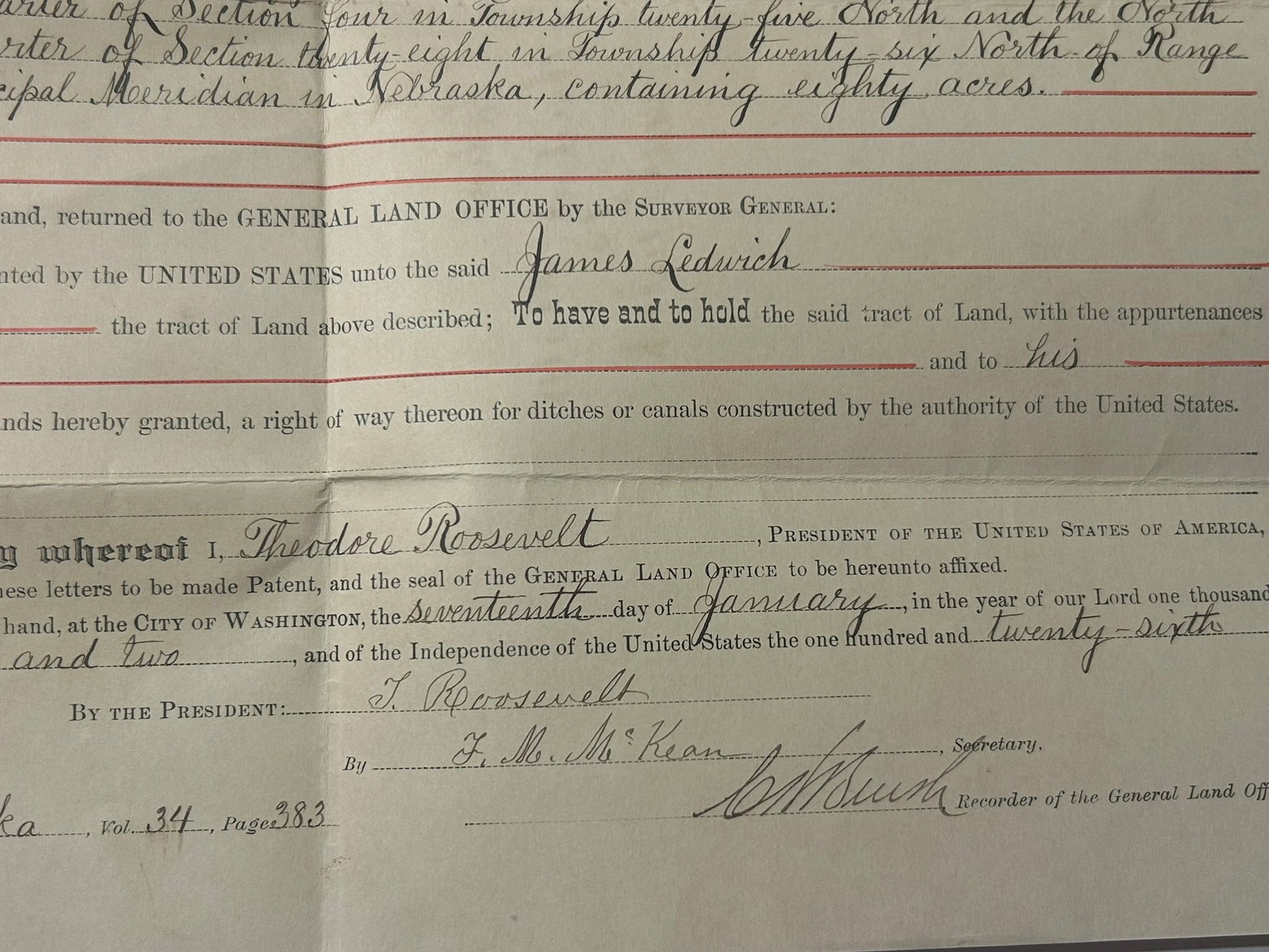 TEDDY ROOSEVELT LAND DOCUMENT 1902 FOR NEBRASKA LAND SIGNED BY ROOSEVELT SECRETARY. CALL OR TEXT FOR MORE INFORMATION