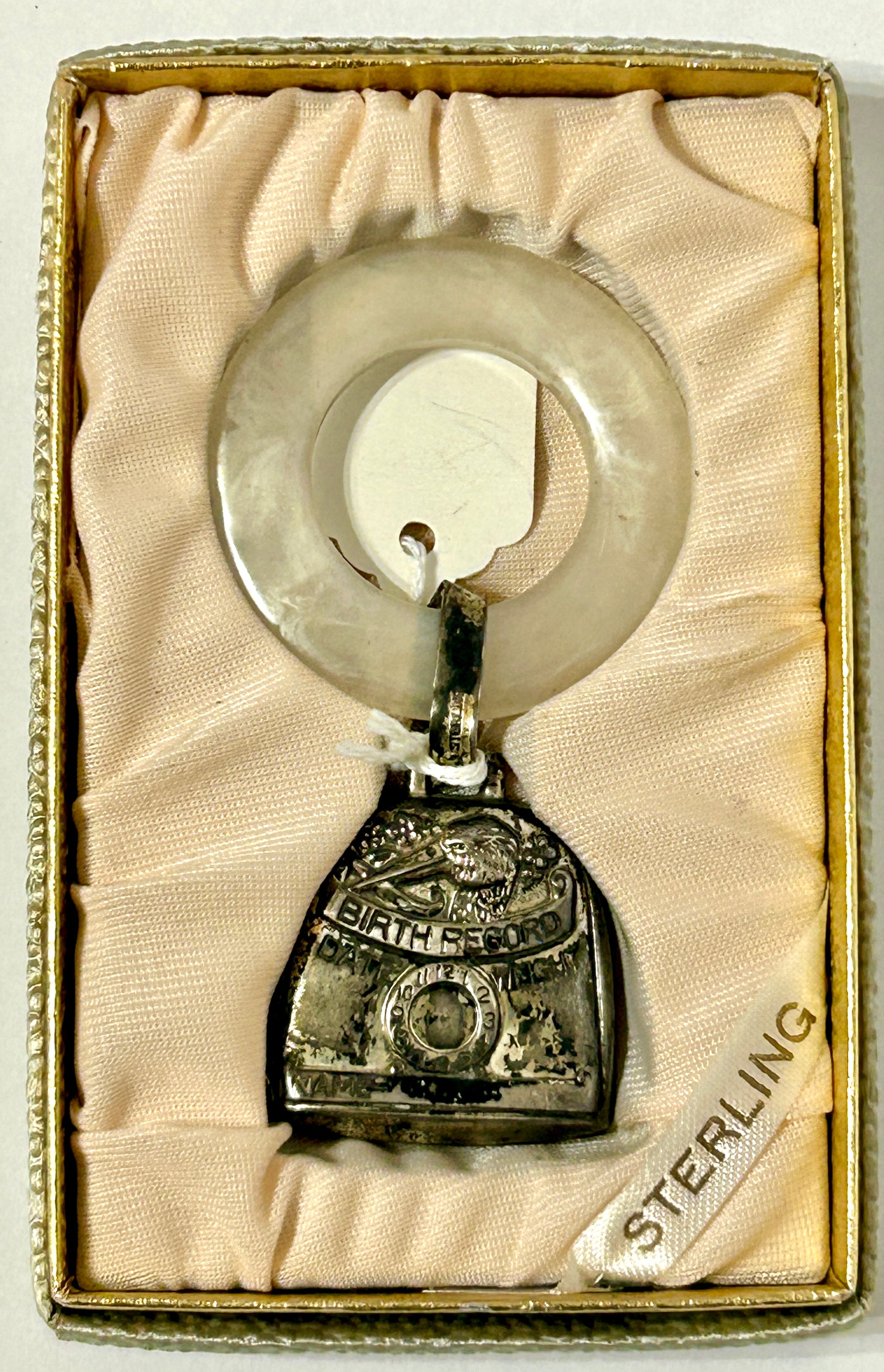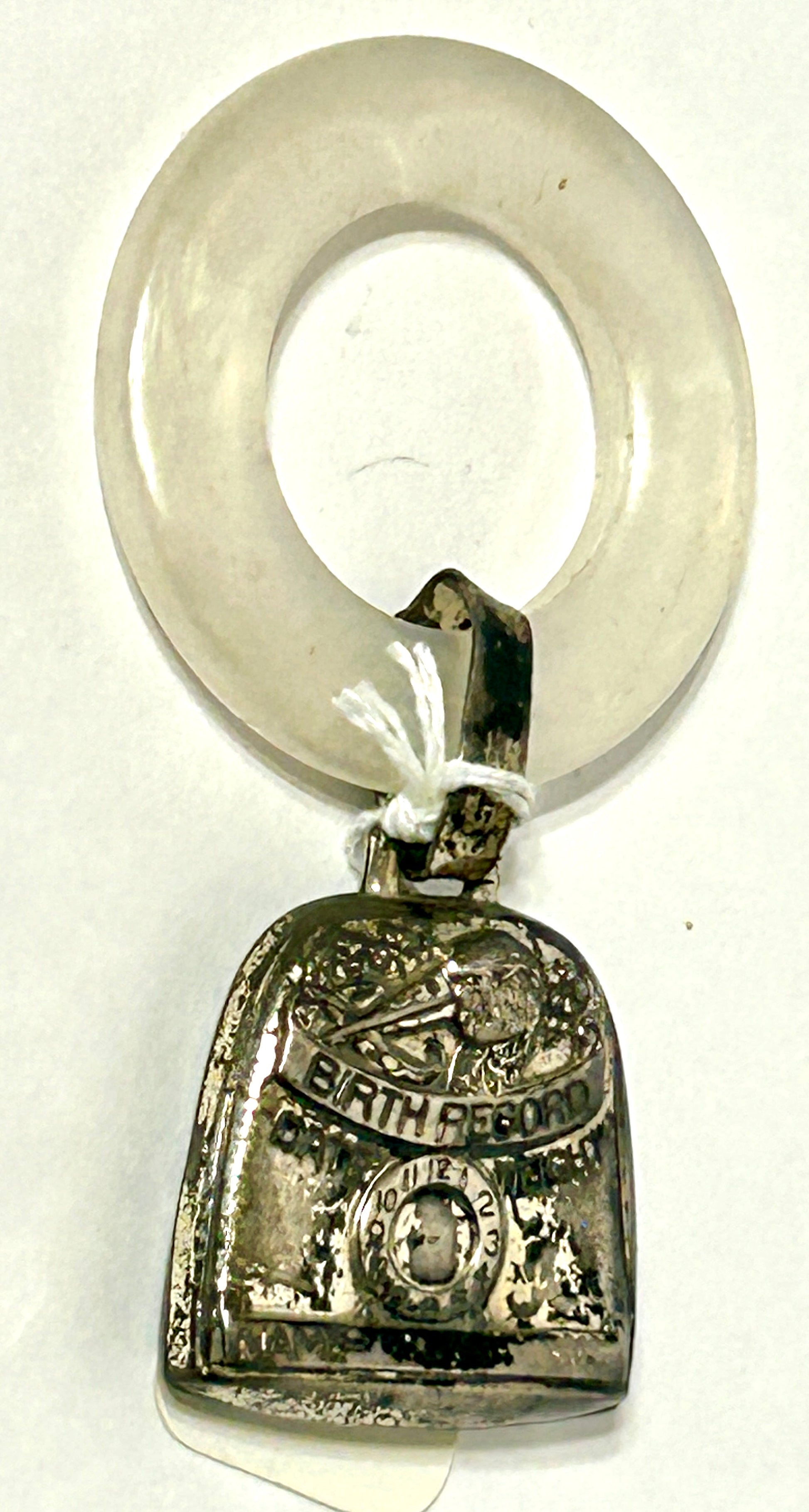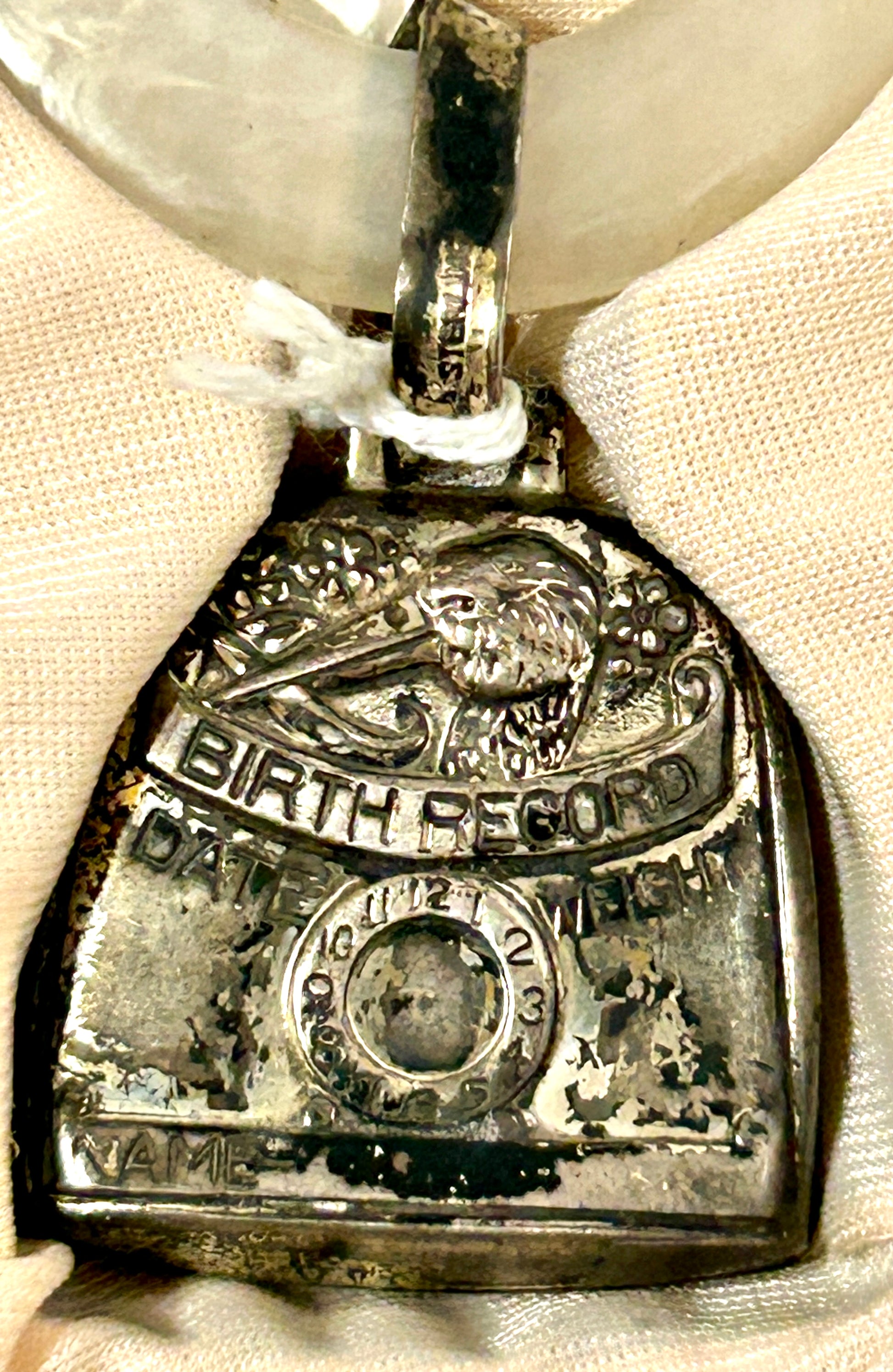 ANTIQUE STERLING AND MOTHER OF PEARL TEETHING RING WITH ENGRAVED BIRTH RECORD 3" LONG. SHIPPING COST EXTRA SO CALL OR TEXT FOR COST TO YOUR ADDRESS