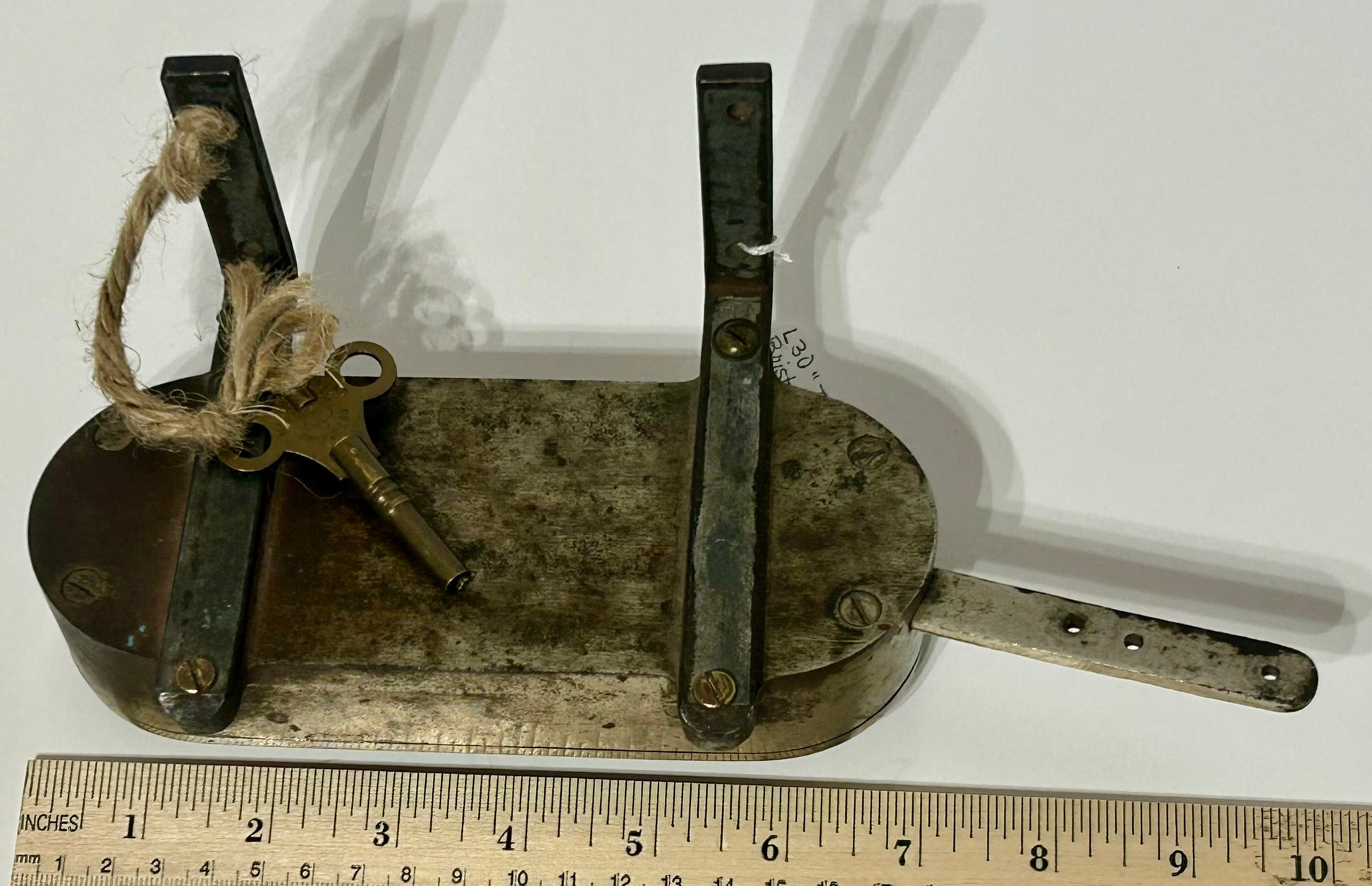 ANTIQUE "THE BRISTOL" 1891 FANCY METAL STREET CAR COUNTER WITH KEY 10" X 4". CALL OR TEXT FOR MORE INFORMATION