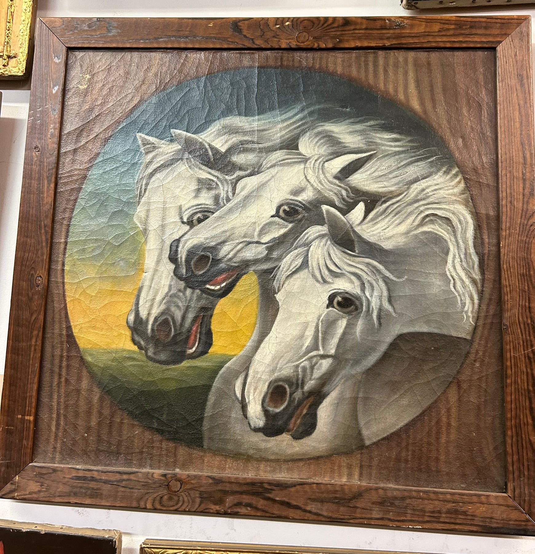 THREE HORSES ANTIQUE OIL PAINTING, 27" X 27". THIS ADOPTATION OF FAMOUS PHARAOH'S HORSES PAINTING WAS FOR YEARS DISPLAYED IN EARLY LIVERLY STABLE. CALL, TEXT, OR E-MAIL FOR MORE INFORMATION
