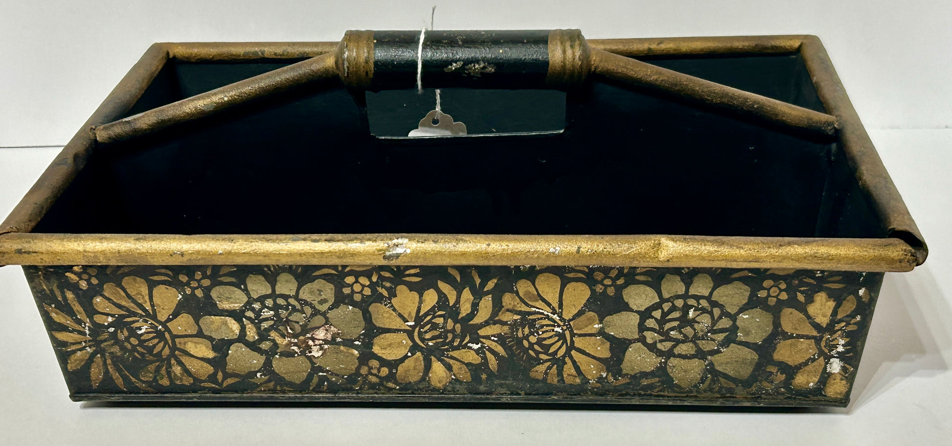 ANTIQUE TOLE DECORATED TINWARE SILVERWARE CADDY 14" X 9" X 3 1/2" TALL. CALL OR TEXT FOR MORE INFORMATION