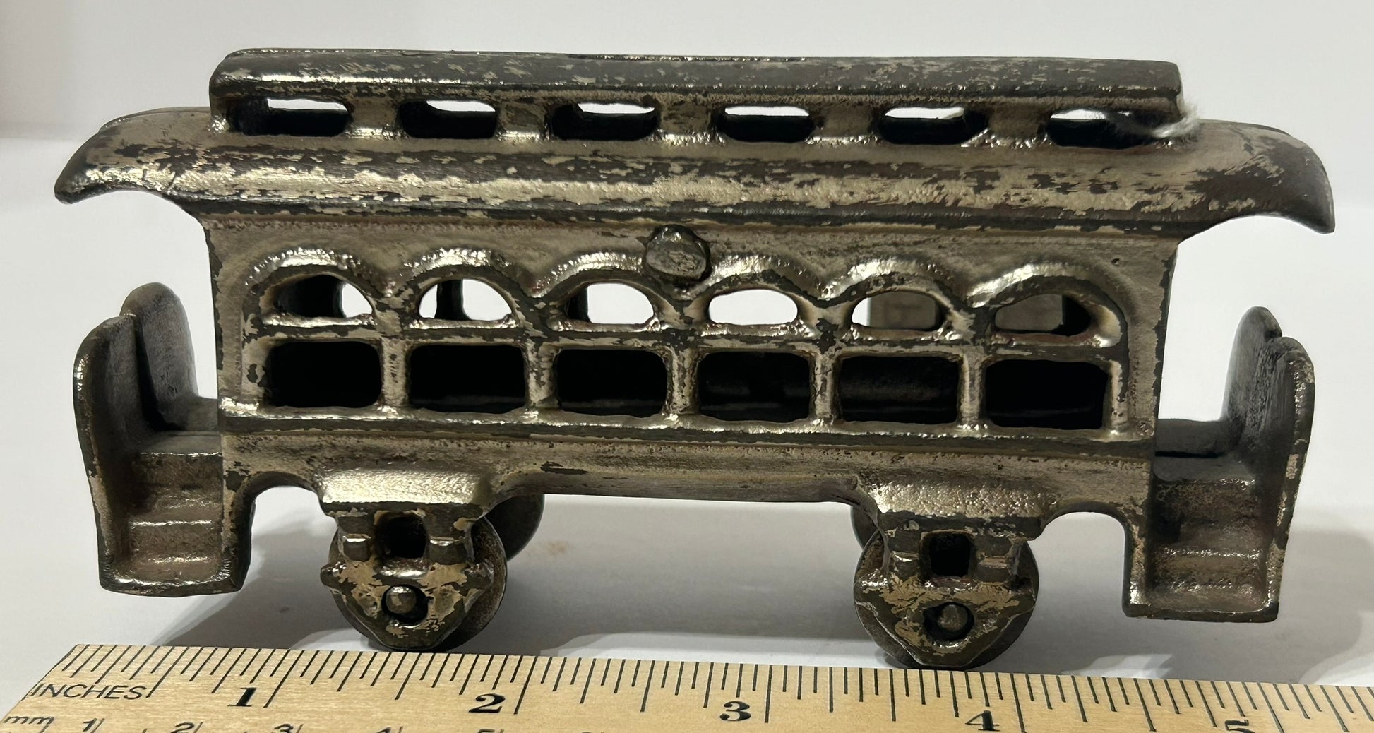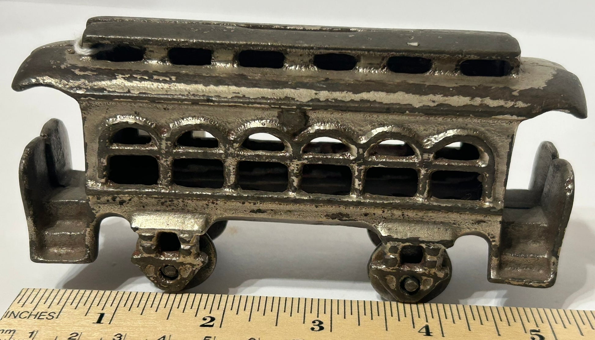 TROLLY CAR CAST IRON ANTIQUE BANK 5" LONG X 2 1/2" TALL. CALL OR TEXT FOR MORE INFORMATION
