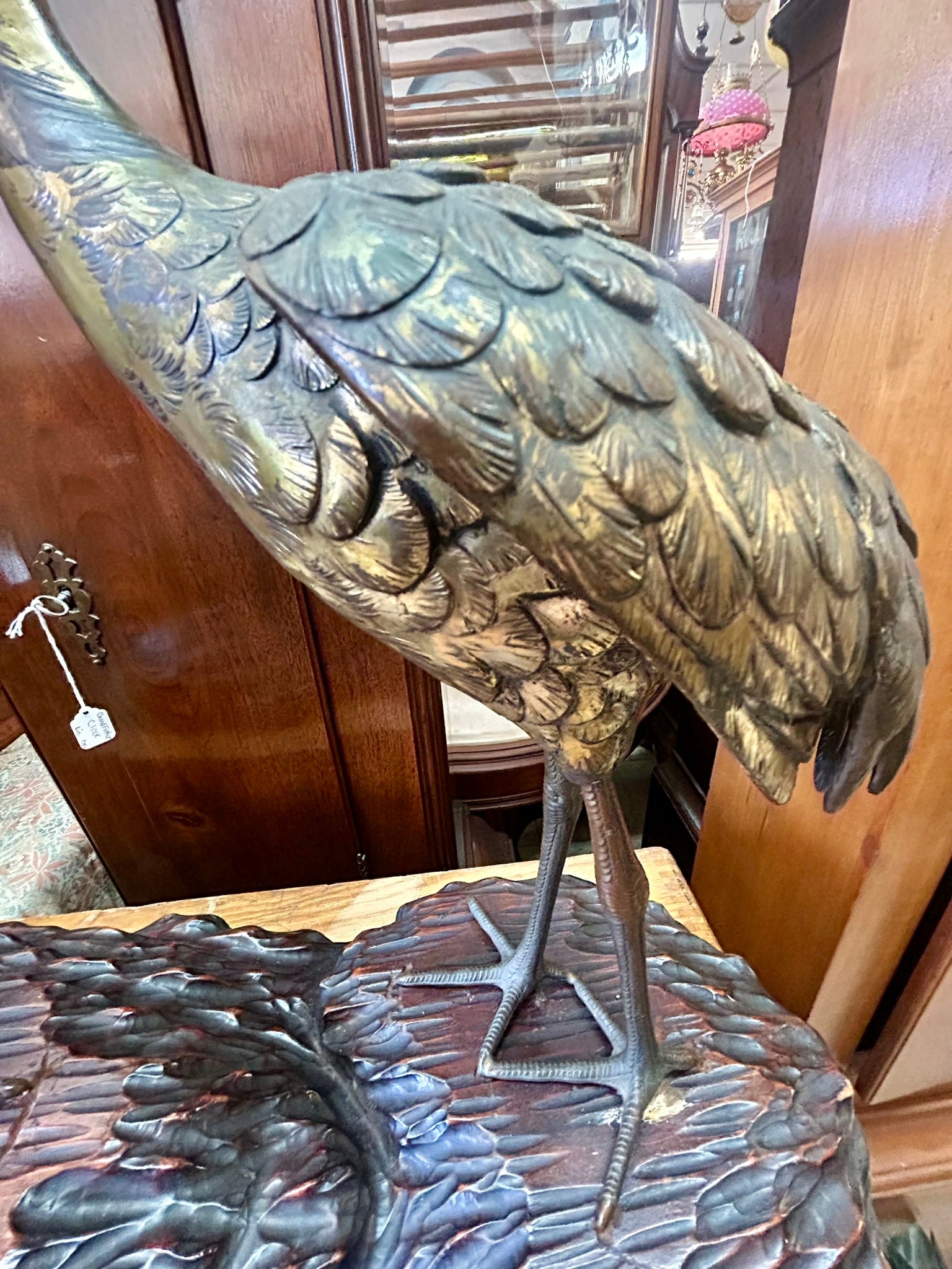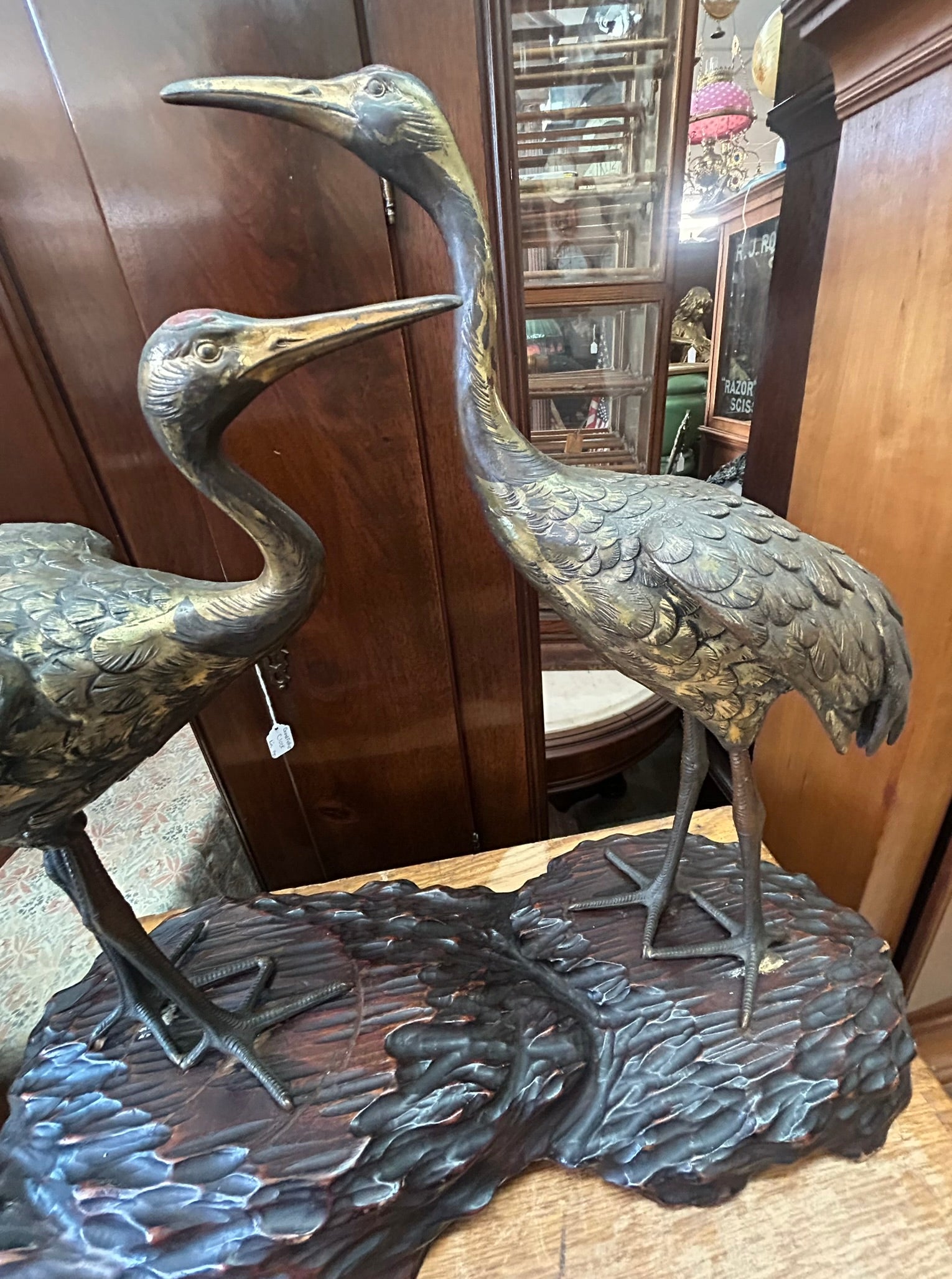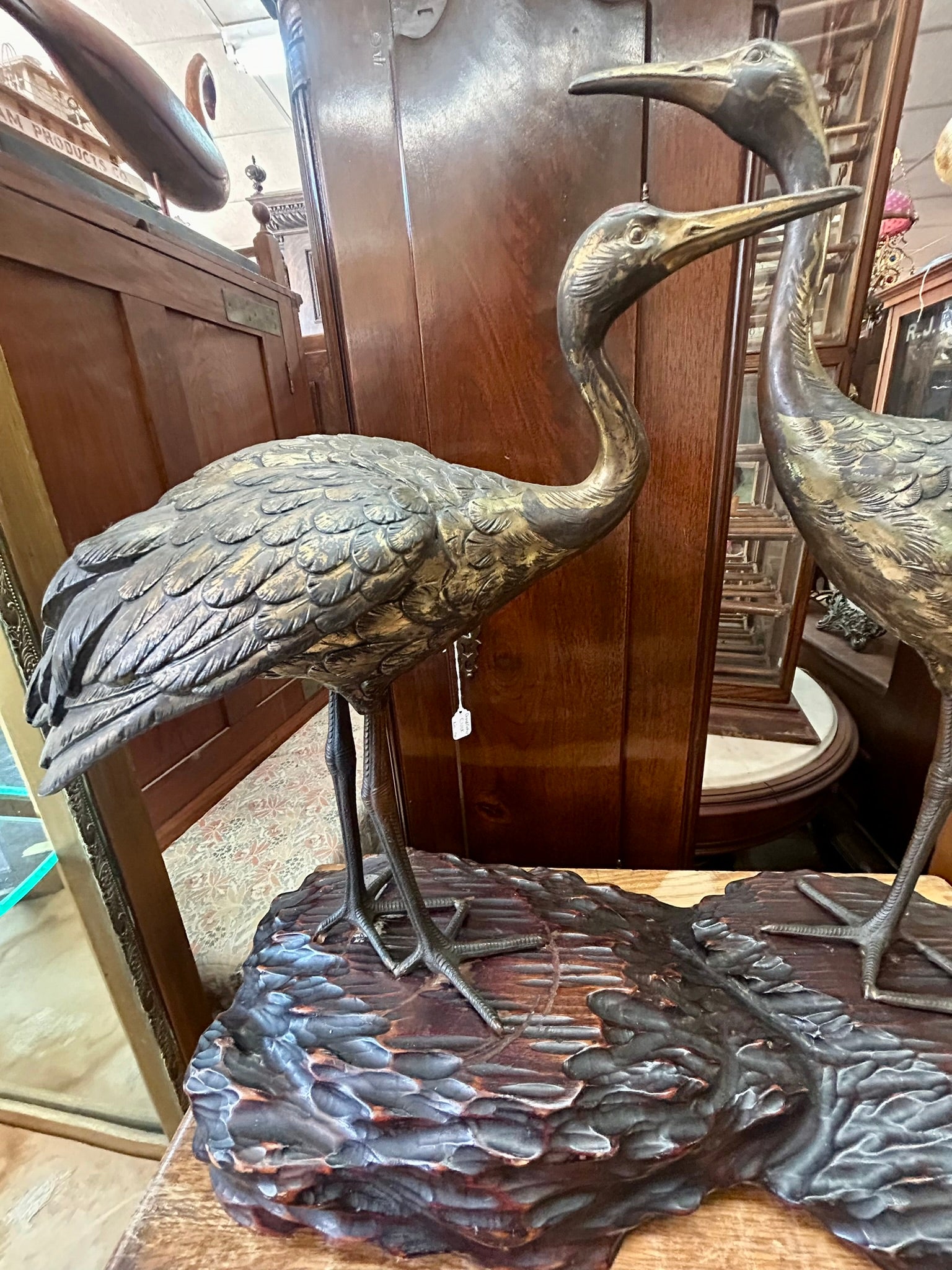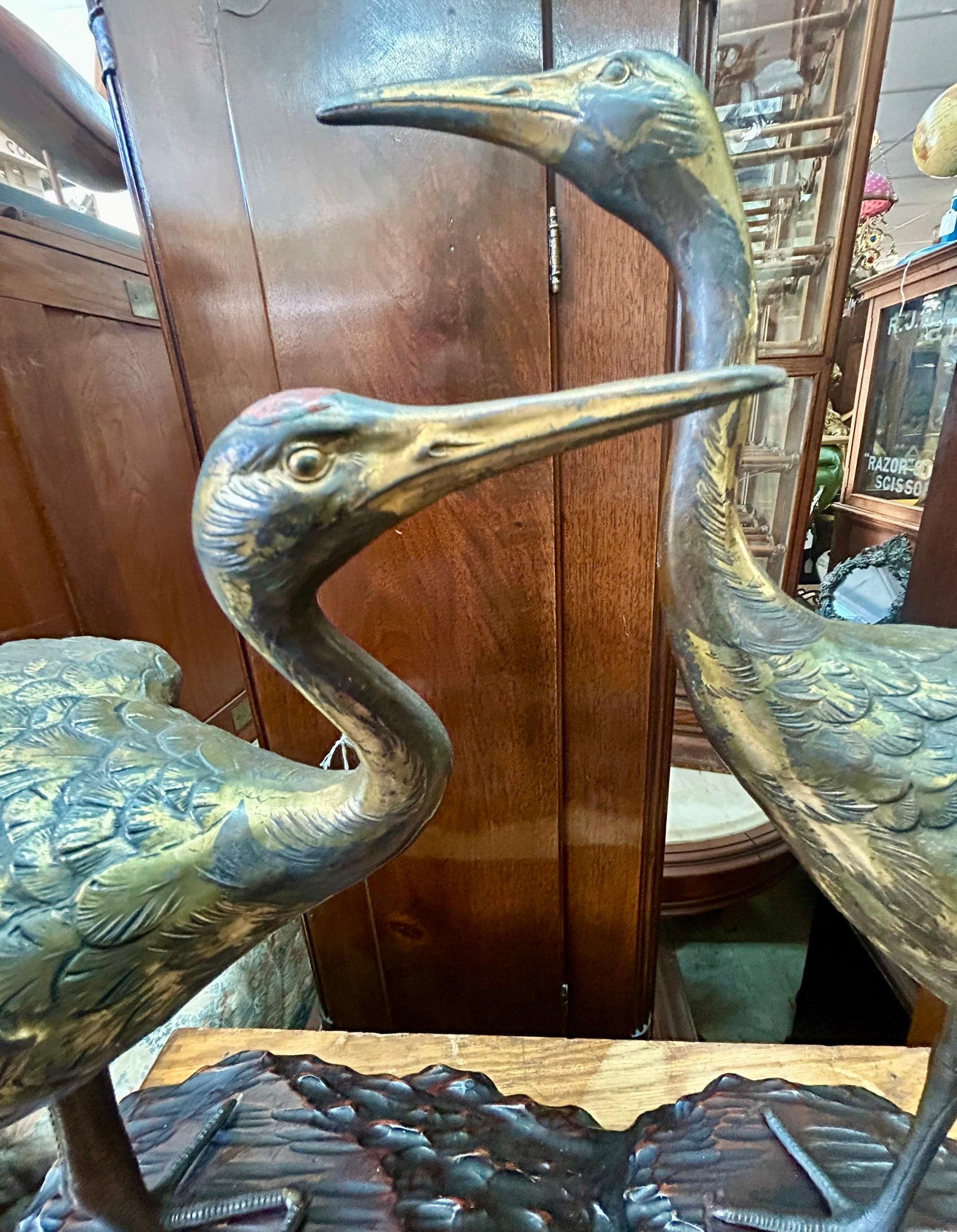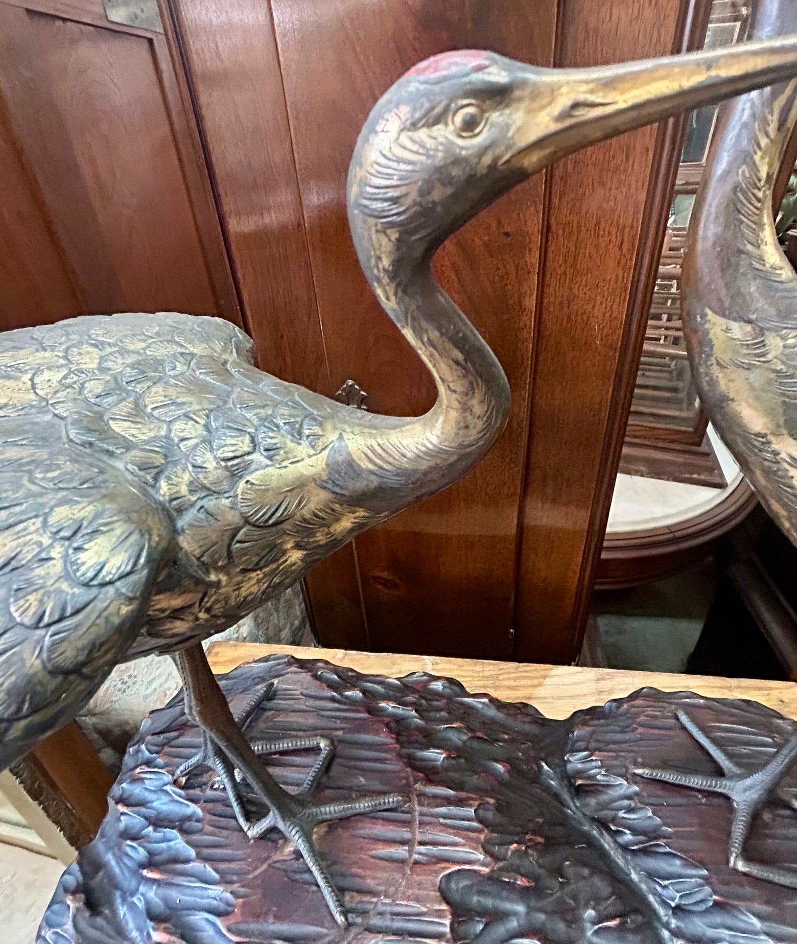 METAL SCULPTURE OF TWO CRANES ON WOOD BASE-PROBABLY JAPANESE 19" TALL X 20" LONG. CALL OR TEXT FOR MORE INFORMATION