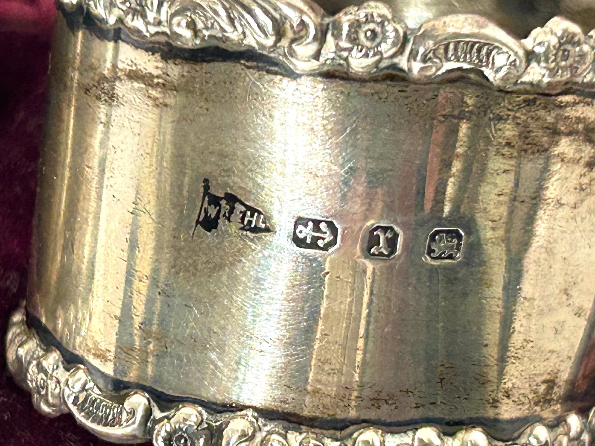 ANTIQUE PAIR OF SILVER NAPKIN RINGS BY WALKER AND HALL IN CASE, EACH NAPKIN RING IS 1 3/4" DIA. AND BOTH WEIGH A TOTAL OF 77.7 GRAMS. SHIPPING IS EXTRA SO CALL OR TEXT TO FIND OUT HOW MUCH SHIPPING WILL COST