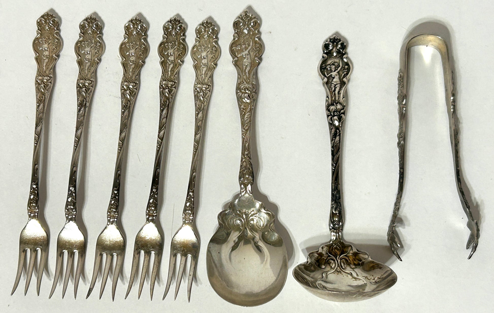 WALLACE STERLING IRIAN PATTERN OYSTER FORKS, CREAM LADLE, SUGAR SPOON, BON BON TONGS, FORKS ARE 5 3/4" LONG EACH. SHIPPING IS EXTRA SO CALL OR TEXT TO FIND OUT HOW MUCH SHIPPING WILL COST