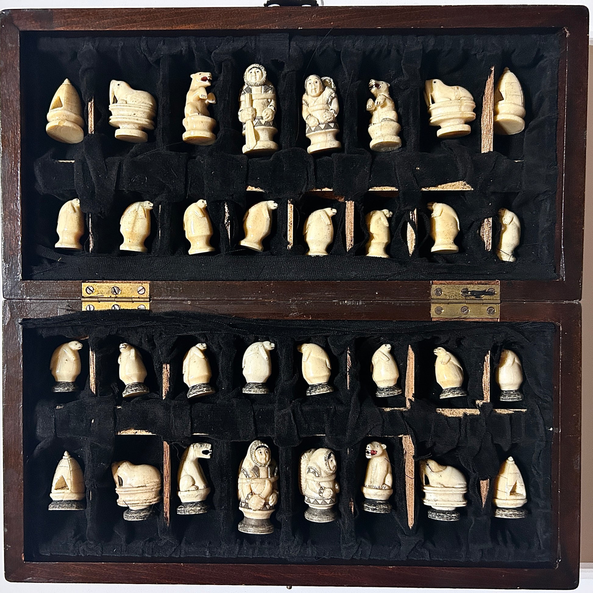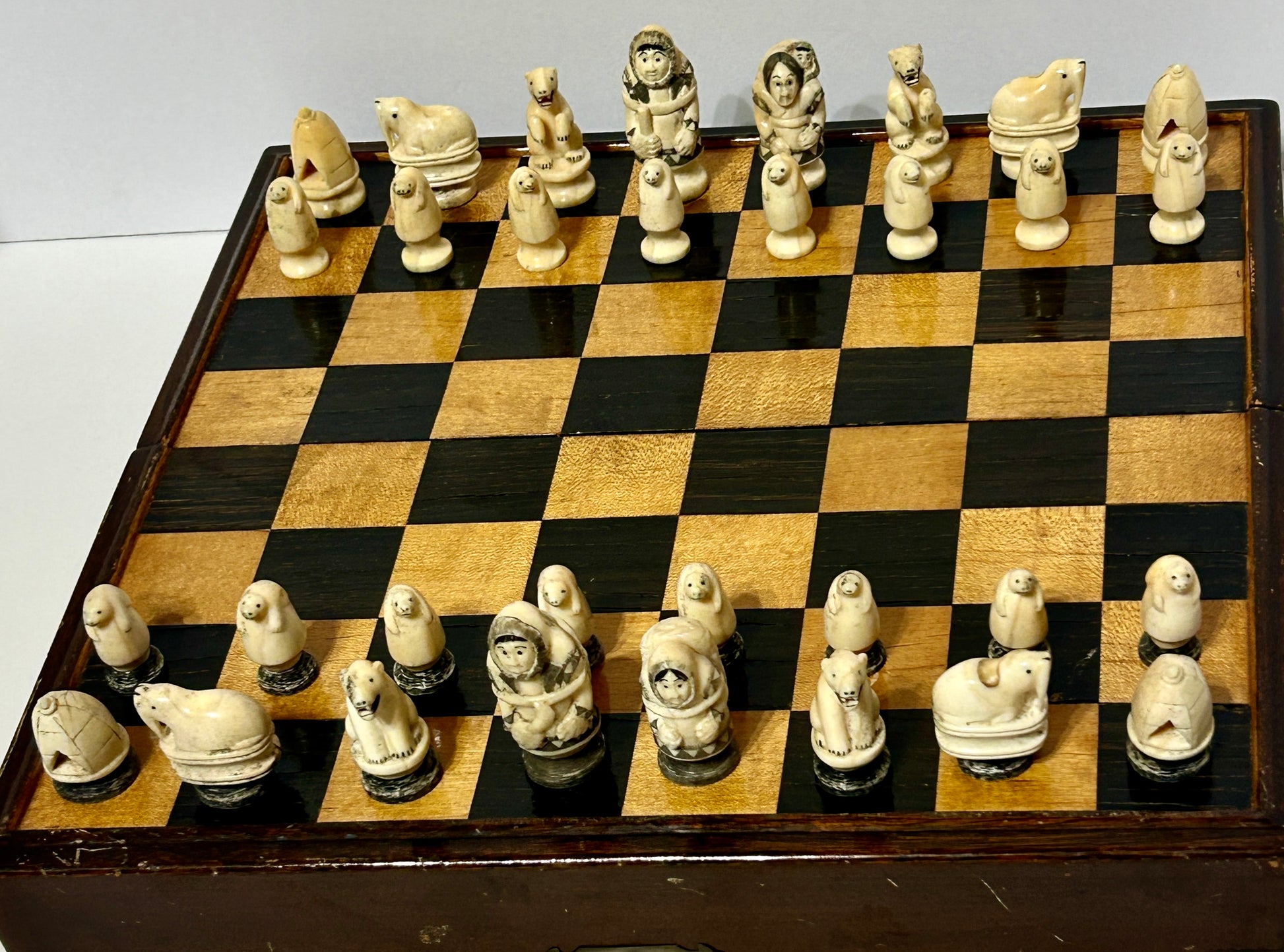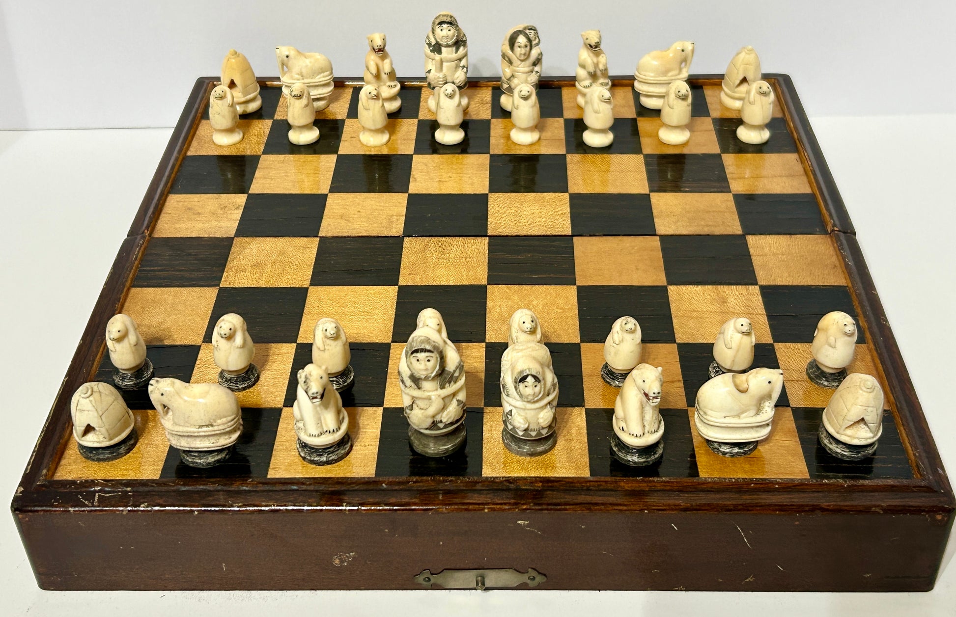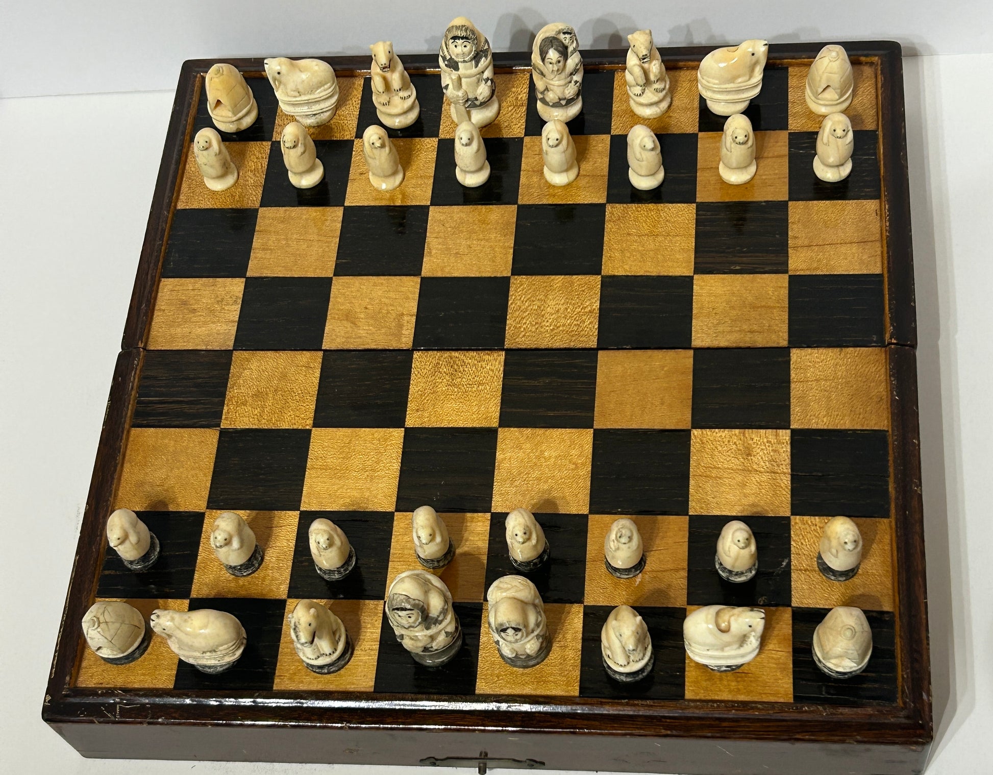 CHESS SET CARVED FROM WALRUS IVORY BY INUIT NATIVES COMPLETE WITH CHESS BOARD CASE WHICH IS 6" X 12 1/2" CLOSED X 3 1/2" DEEP. CALL OR TEXT FOR MORE INFORMATION