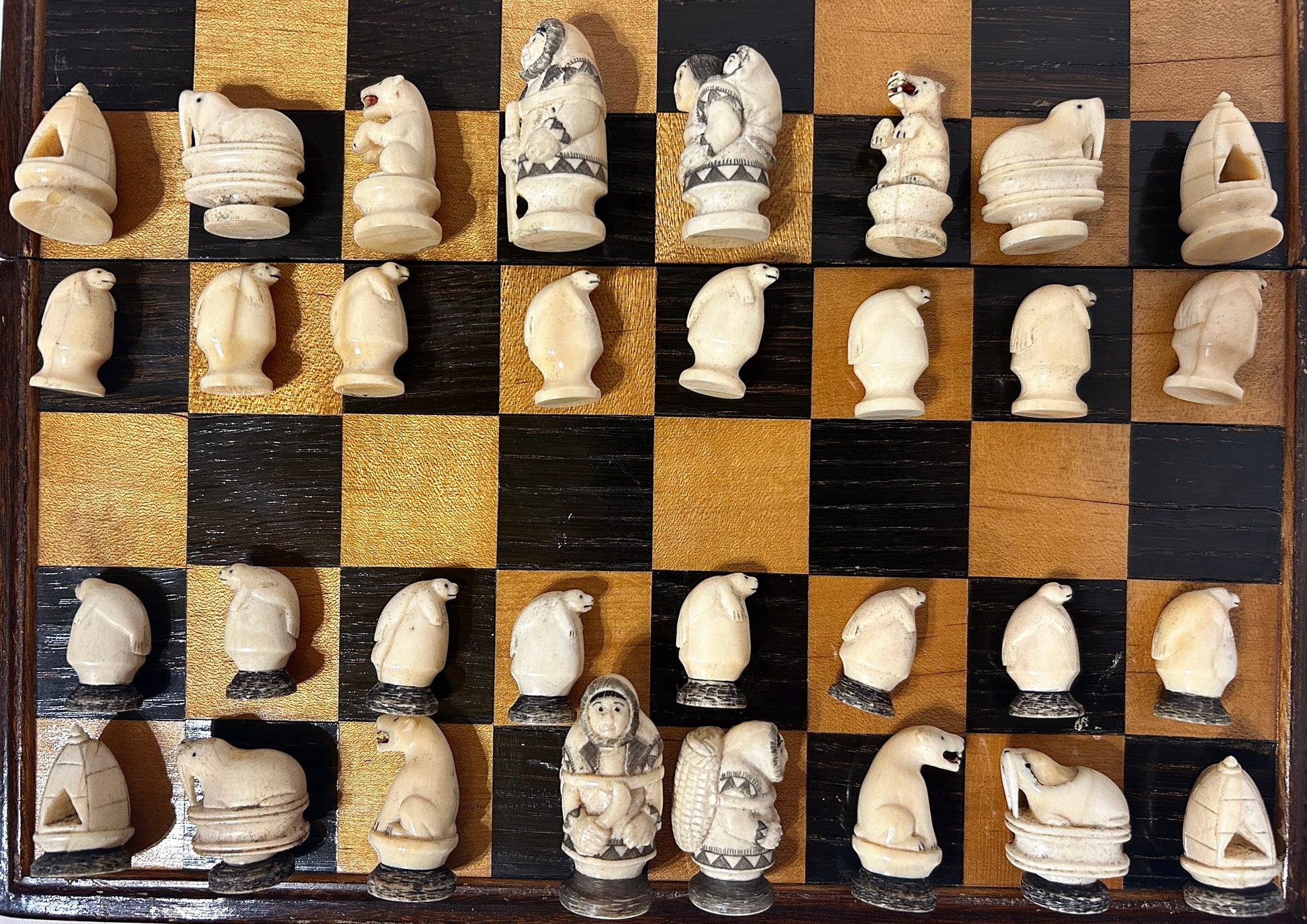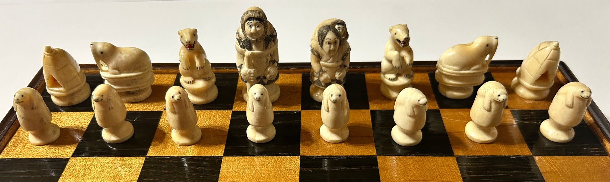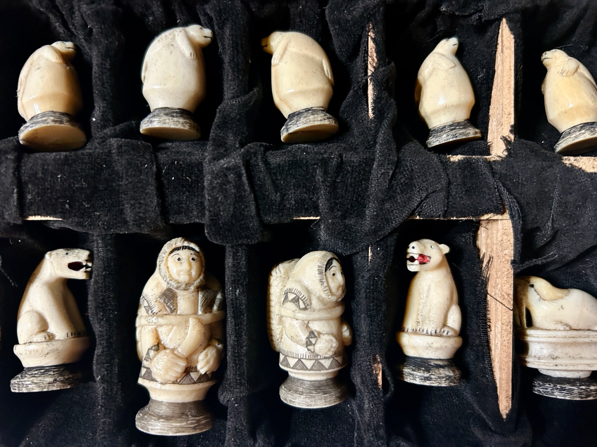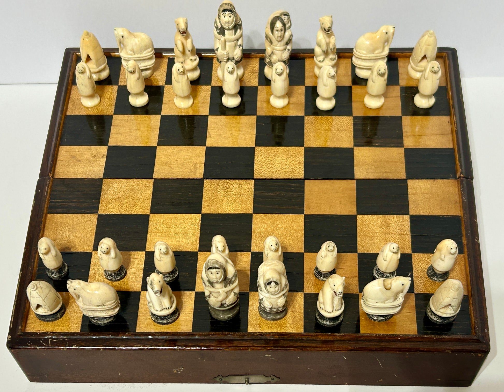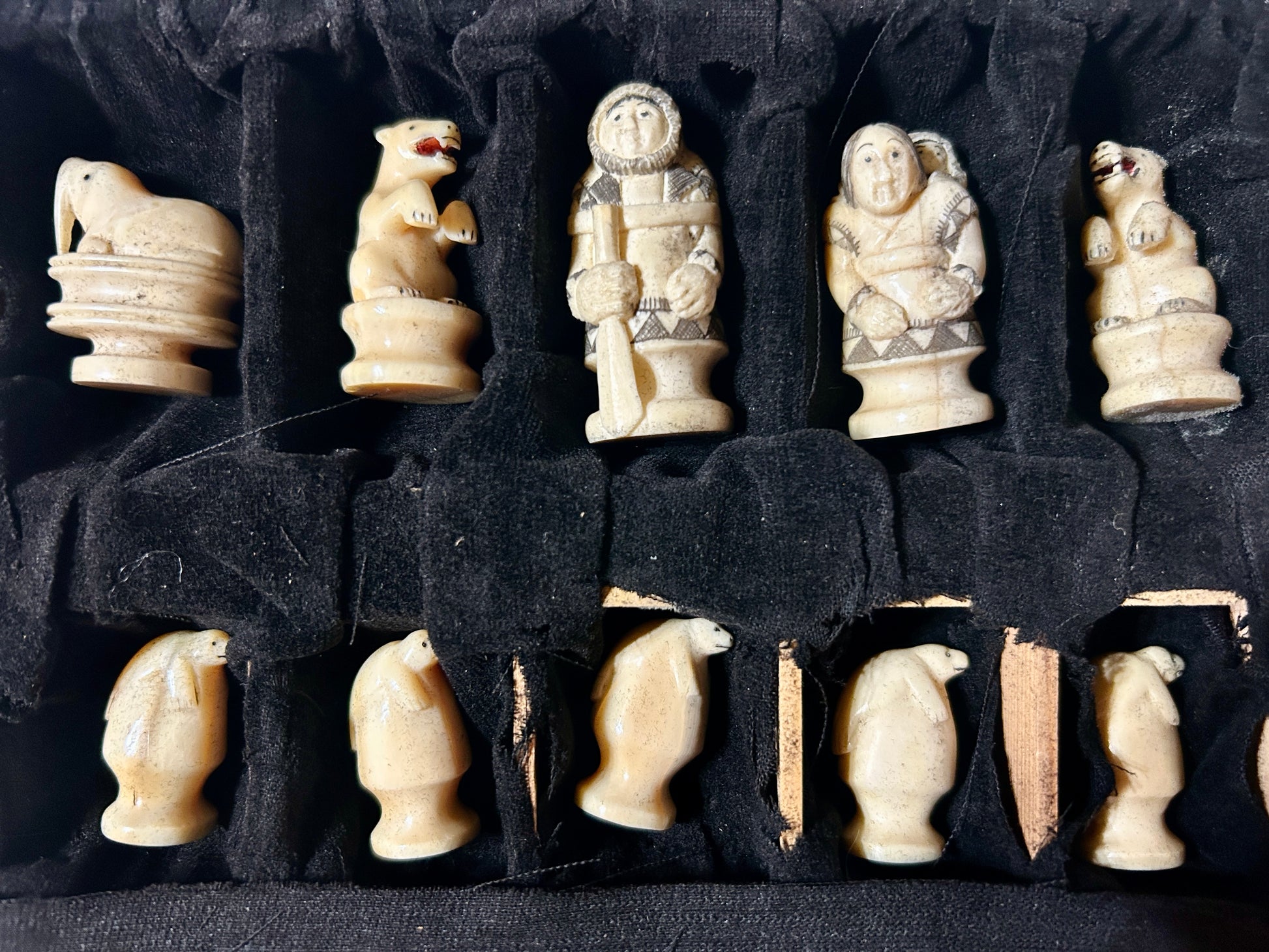 CHESS SET CARVED FROM WALRUS IVORY BY INUIT NATIVES COMPLETE WITH CHESS BOARD CASE WHICH IS 6" X 12 1/2" CLOSED X 3 1/2" DEEP. CALL OR TEXT FOR MORE INFORMATION