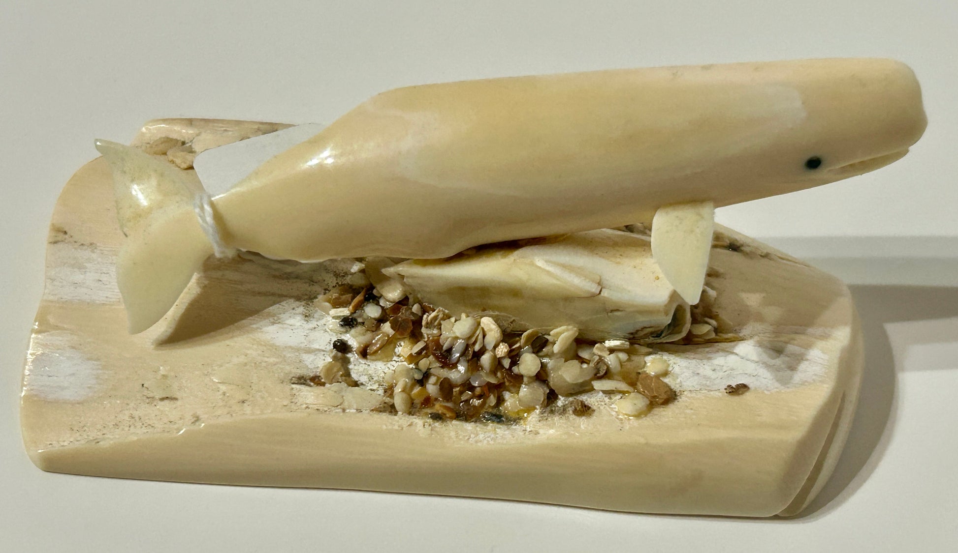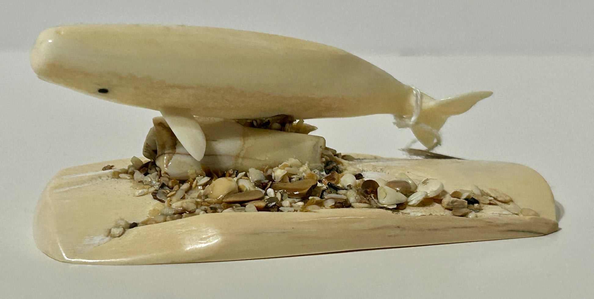 WALRUS IVORY FIGURAL CARVING OF WHALE ARTIST SIGNED 4 1/2" LONG X 1 1/2" TALL. CALL OR TEXT FOR MORE INFORMATION