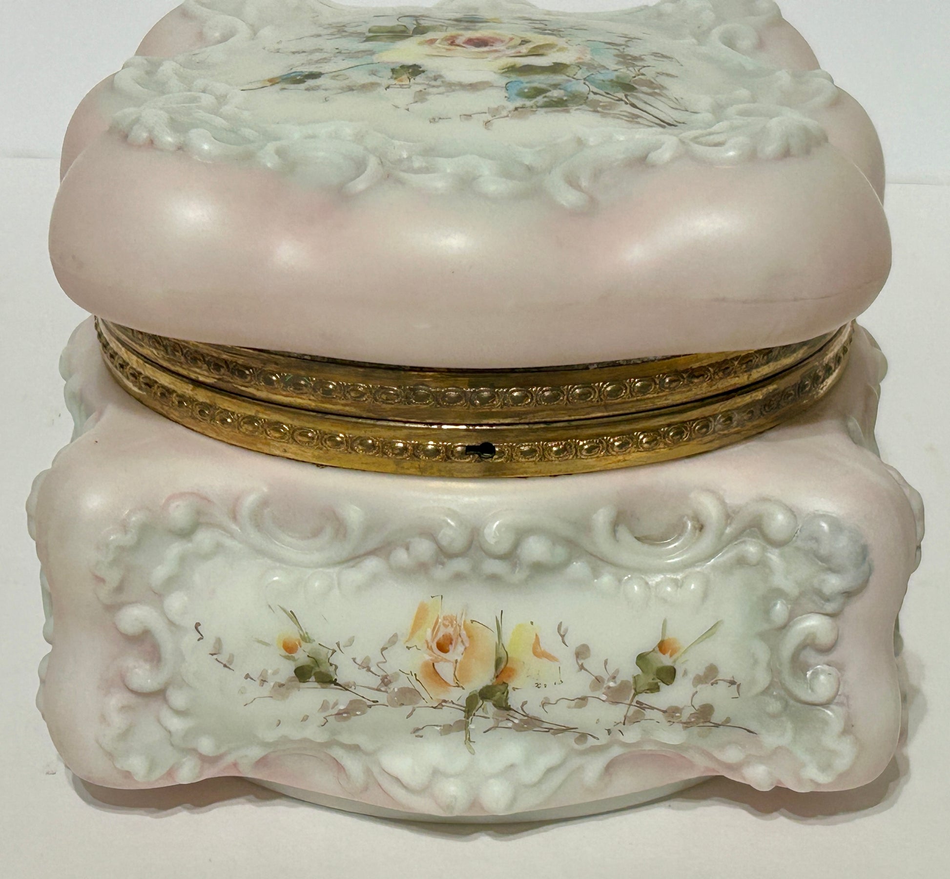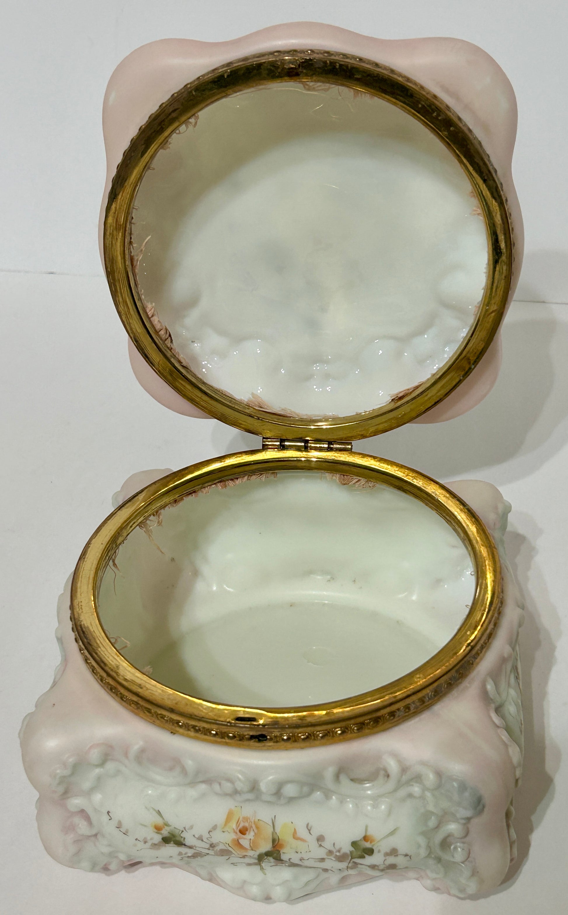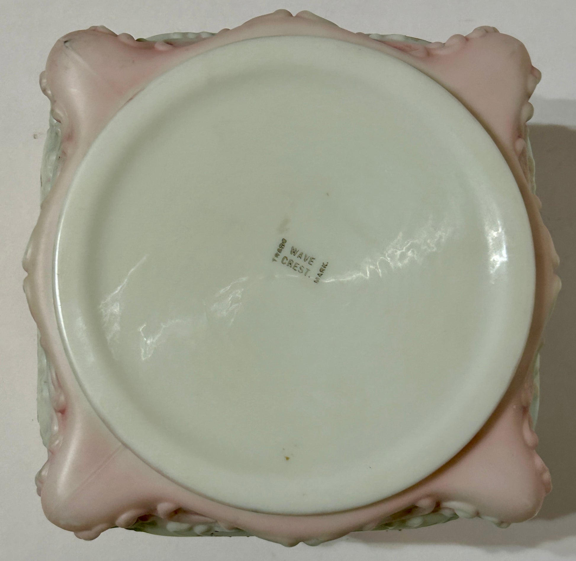 ANTIQUE WAVECREST GLASS LARGE DRESSER BOX PINK WITH ROSES 7" SQUARE X 5 1/2" TALL. SHIPPING IS EXTRA CHARGE SO CALL OR TEXT TO FIND OUT WHAT WE WILL HAVE TO PAY TO SHIP TO YOUR ADDRESS