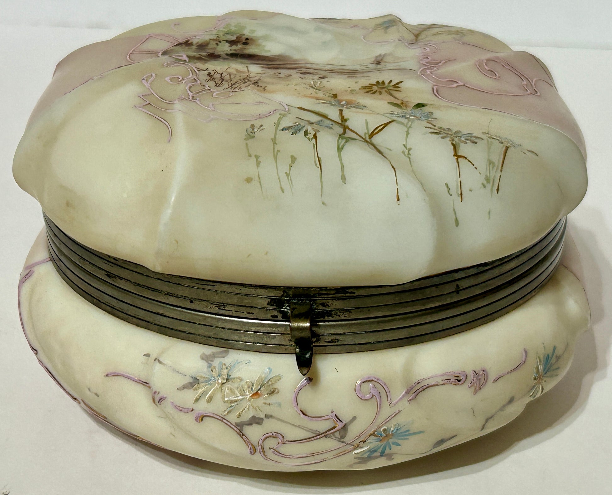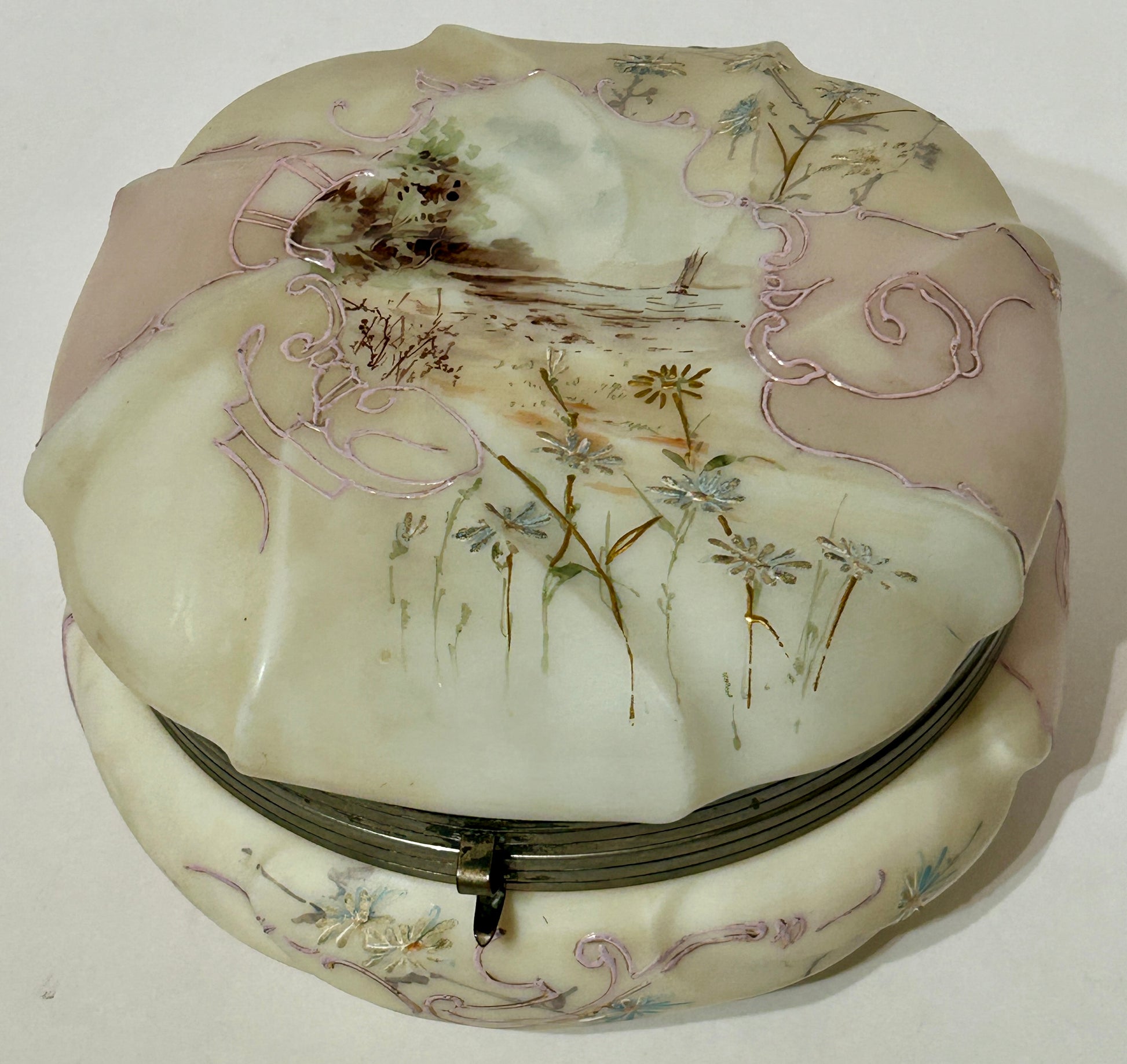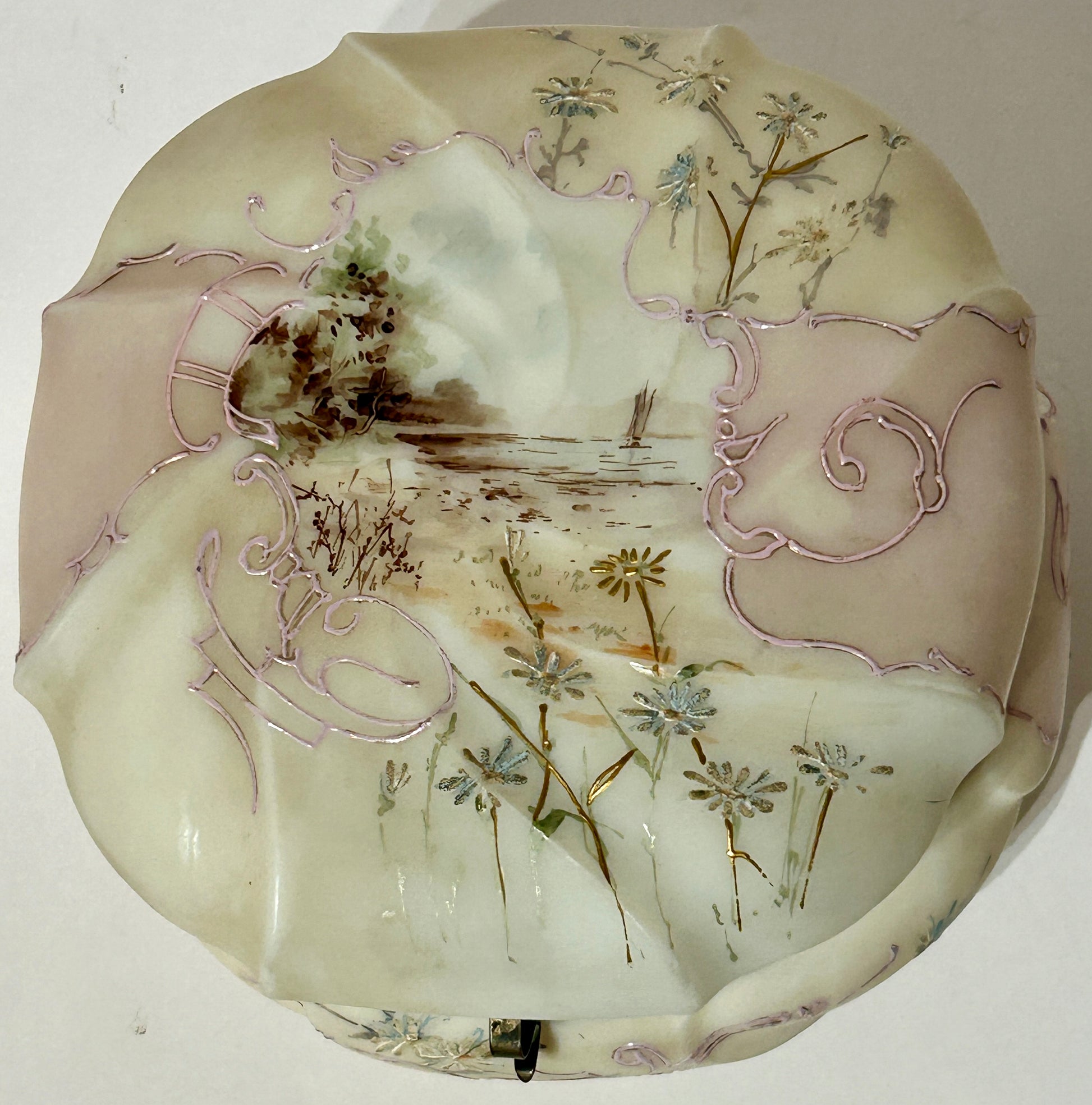 LARGE WAVECREST BOX WITH SCENIC DECORATION 7 1/4" DIAMETER X 4" TALL UNMARKED. SHIPPING IS EXTRA CHARGE SO CALL OR TEXT TO FIND OUT WHAT WE WILL HAVE TO PAY TO SHIP THIS ITEM TO YOUR ADDRESS