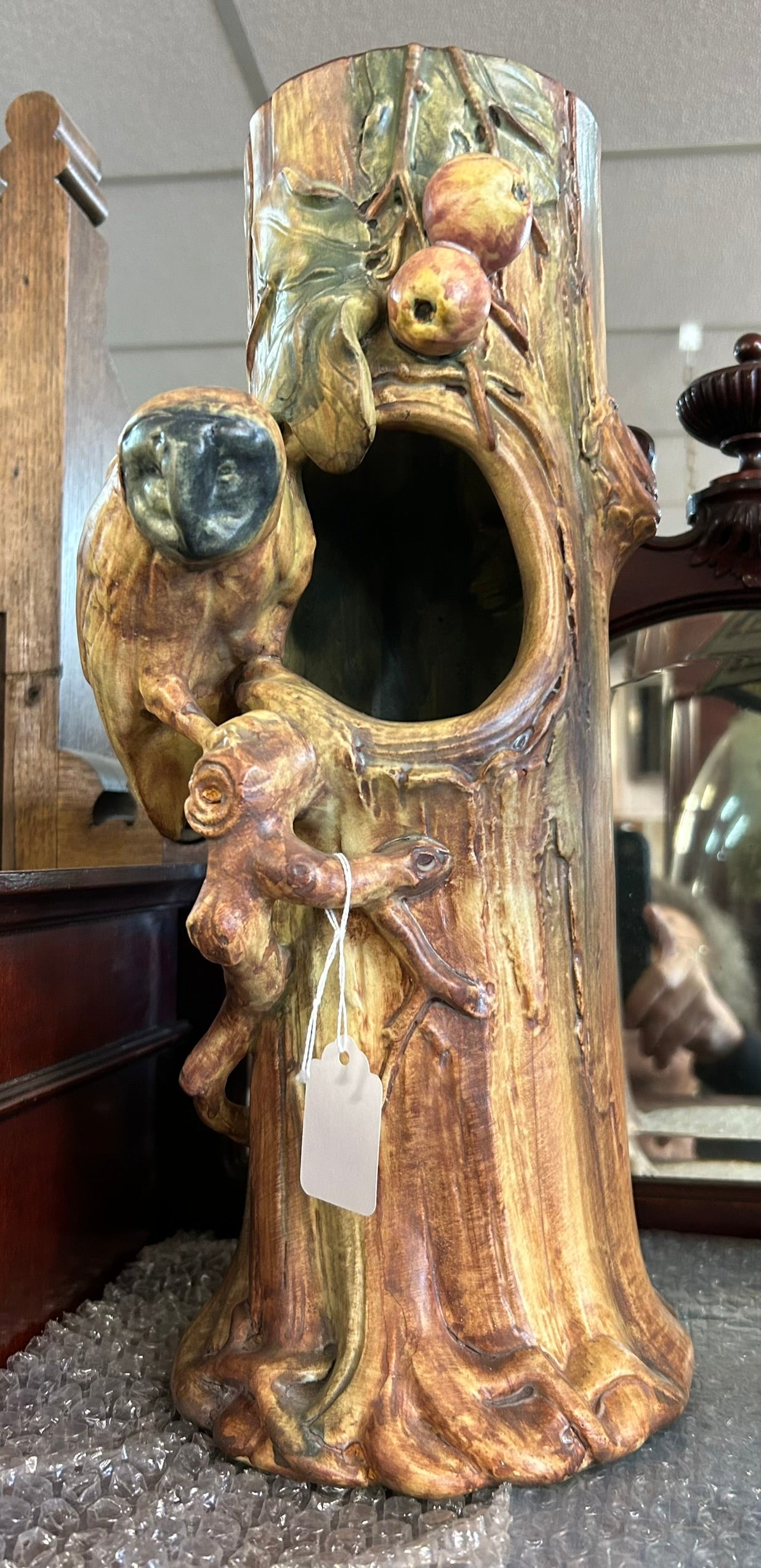 WELLER LARGE POTTERY OWL VASE WITH THREE DIMENSIONAL OWL ON TREE TRUNK 15 1/2" TALL. CALL, TEXT, OR E-MAIL FOR MORE INFORMATION