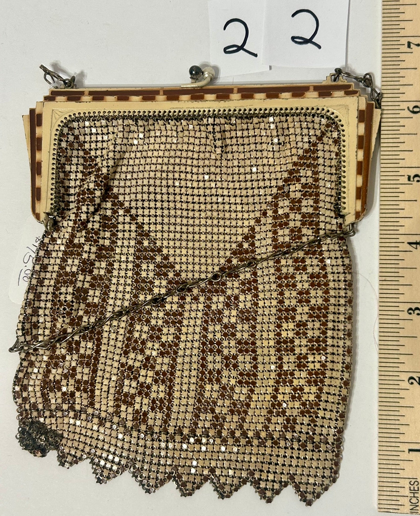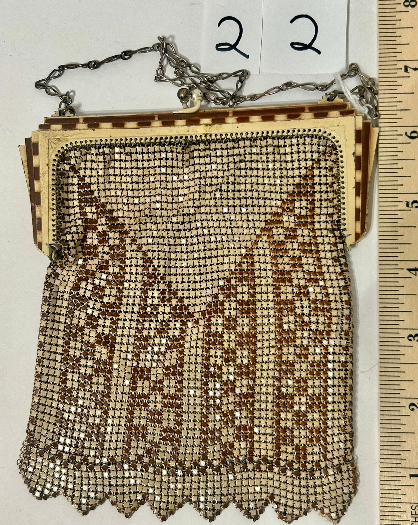 ANTIQUE WHITING AND DAVIS BROWN AND WHITE MESH PURSE 7" LONG. CALL OR TEXT FOR MORE INFORMATION