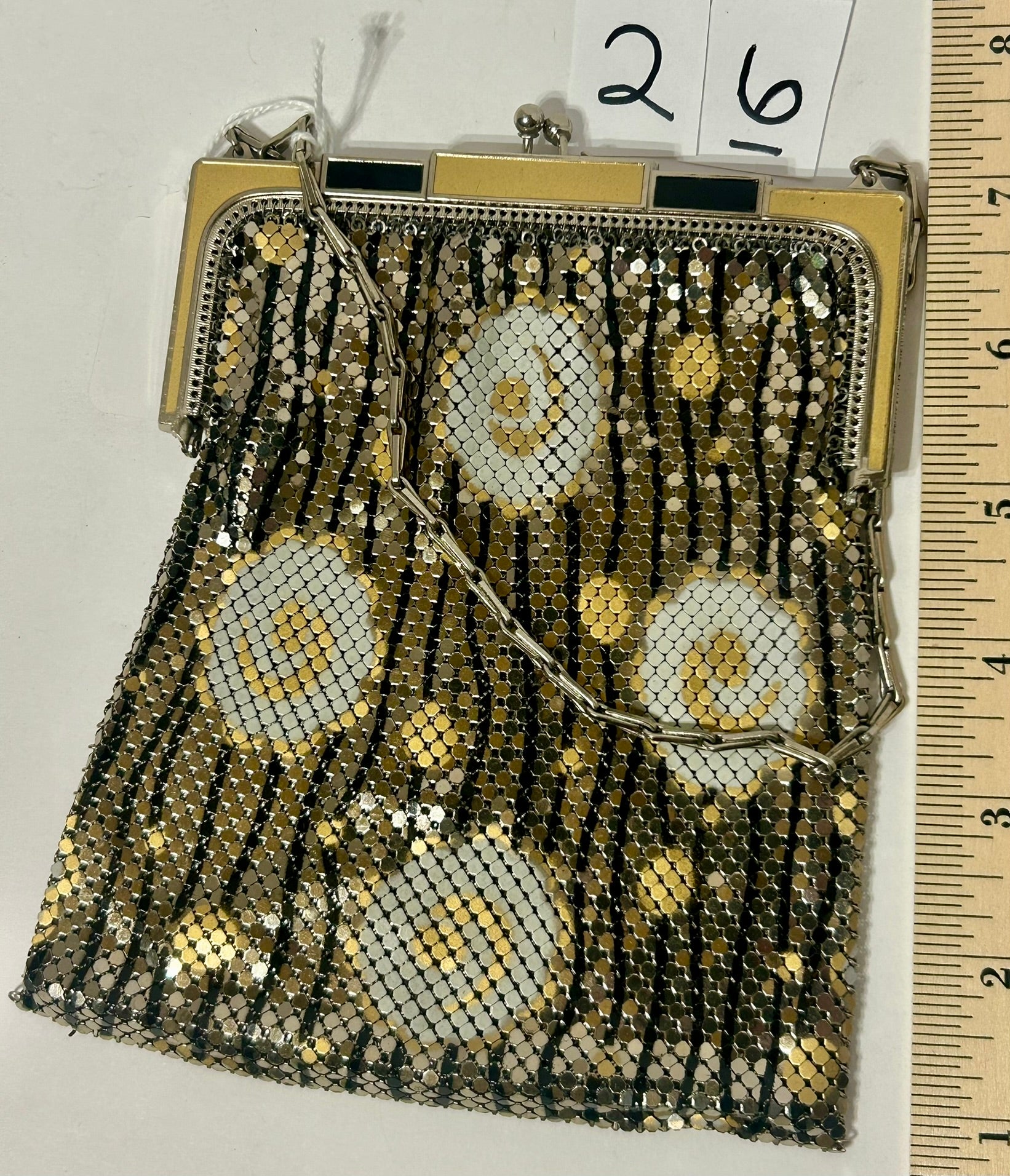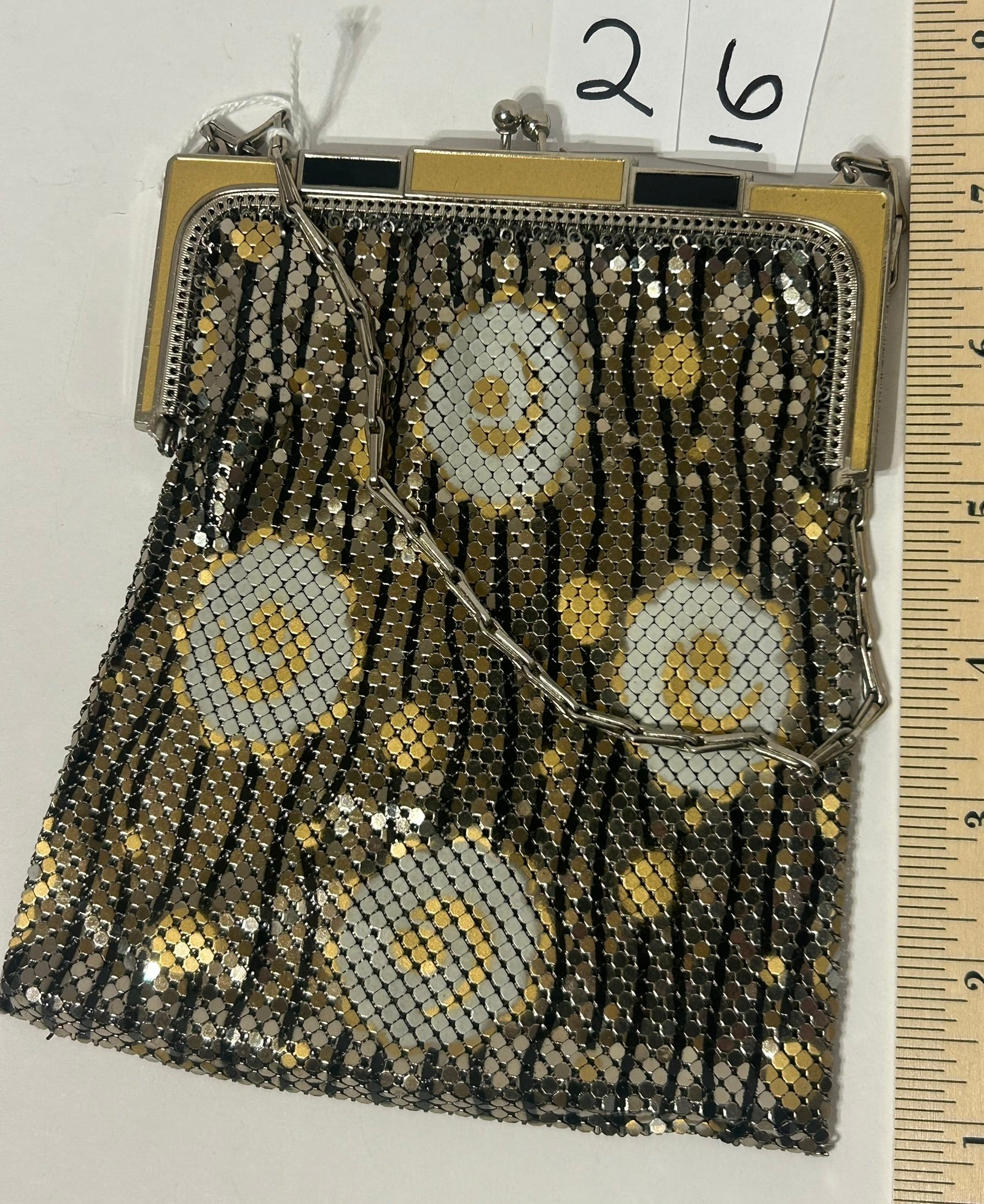ANTIQUE WHITING & DAVIS ENAMELED SILVER & GOLD MESH PURSE WITH ENAMELED CIRCLE DESIGN 7" LONG, CALL OR TEXT FOR MORE INFORMATION