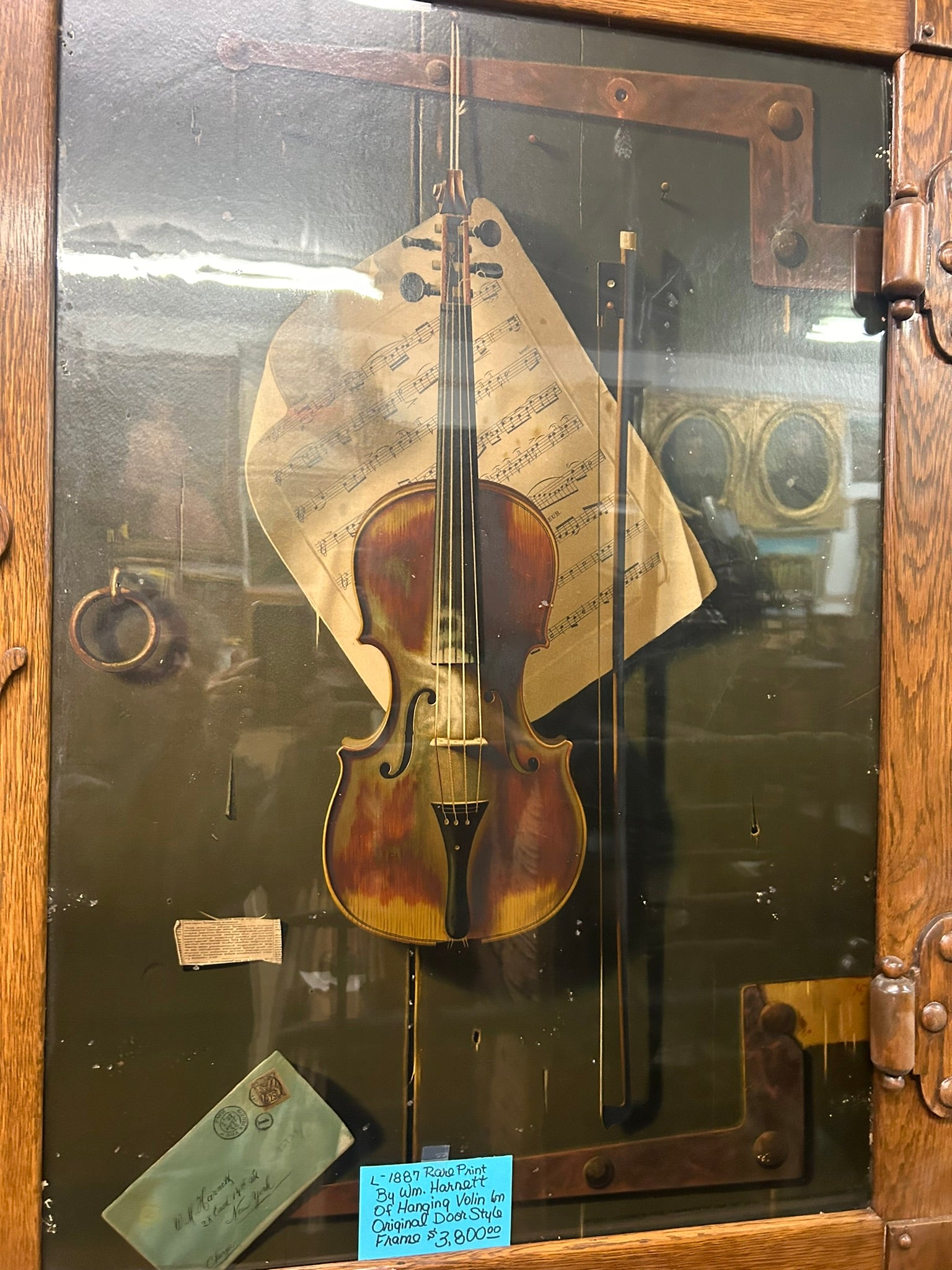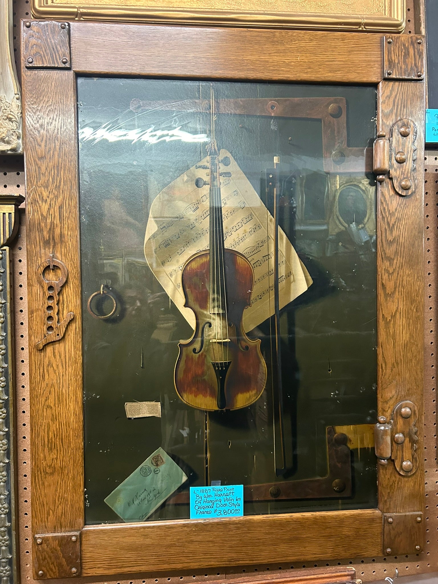 WM. HARNETT RARE 1887 HANGING VIOLIN RARE PRINT IN ORIGINAL DOOR STYLE WOODEN FRAME, 42" X 31". CALL, TEXT, OR E-MAIL FOR MORE INFORMATION