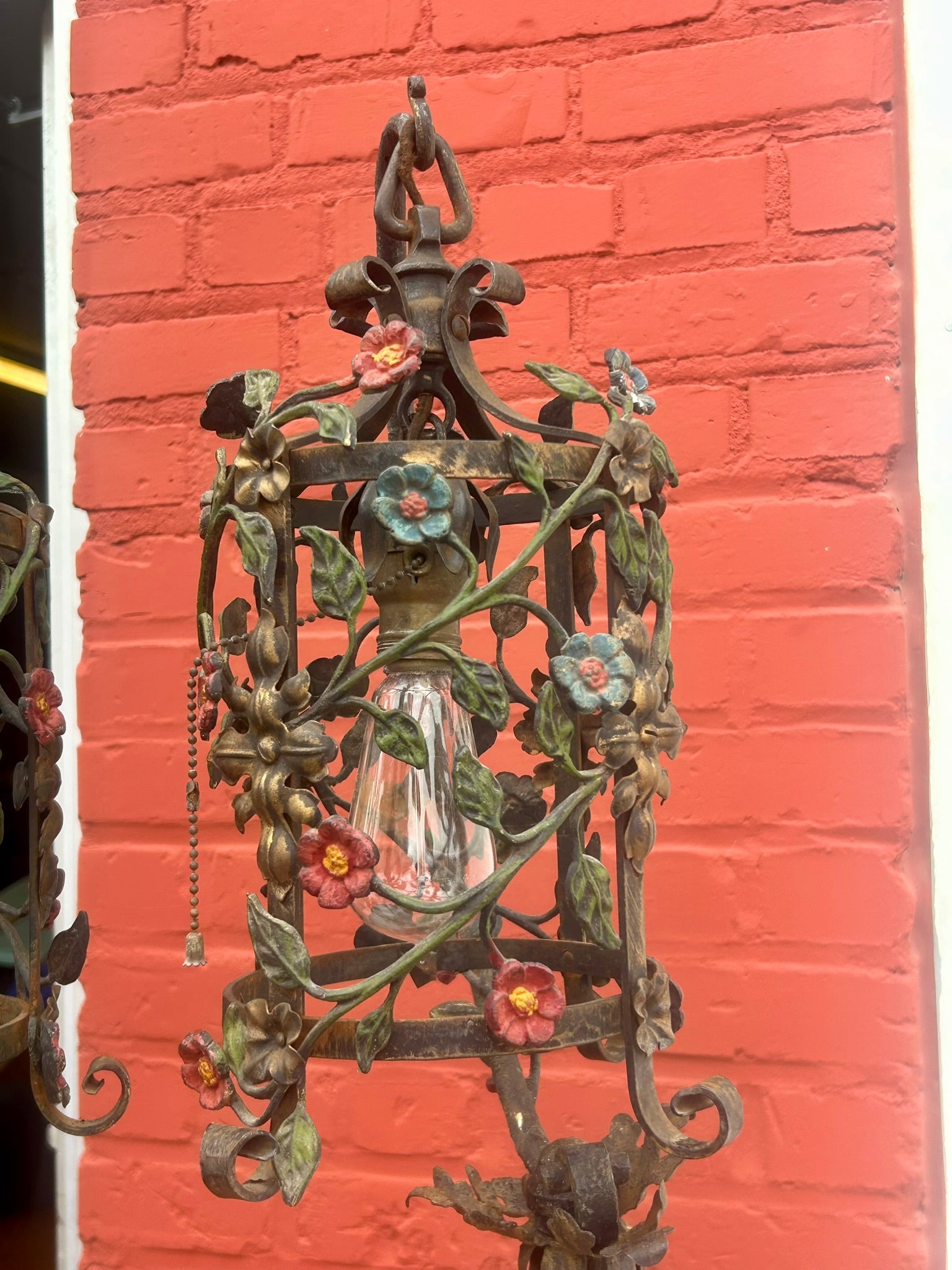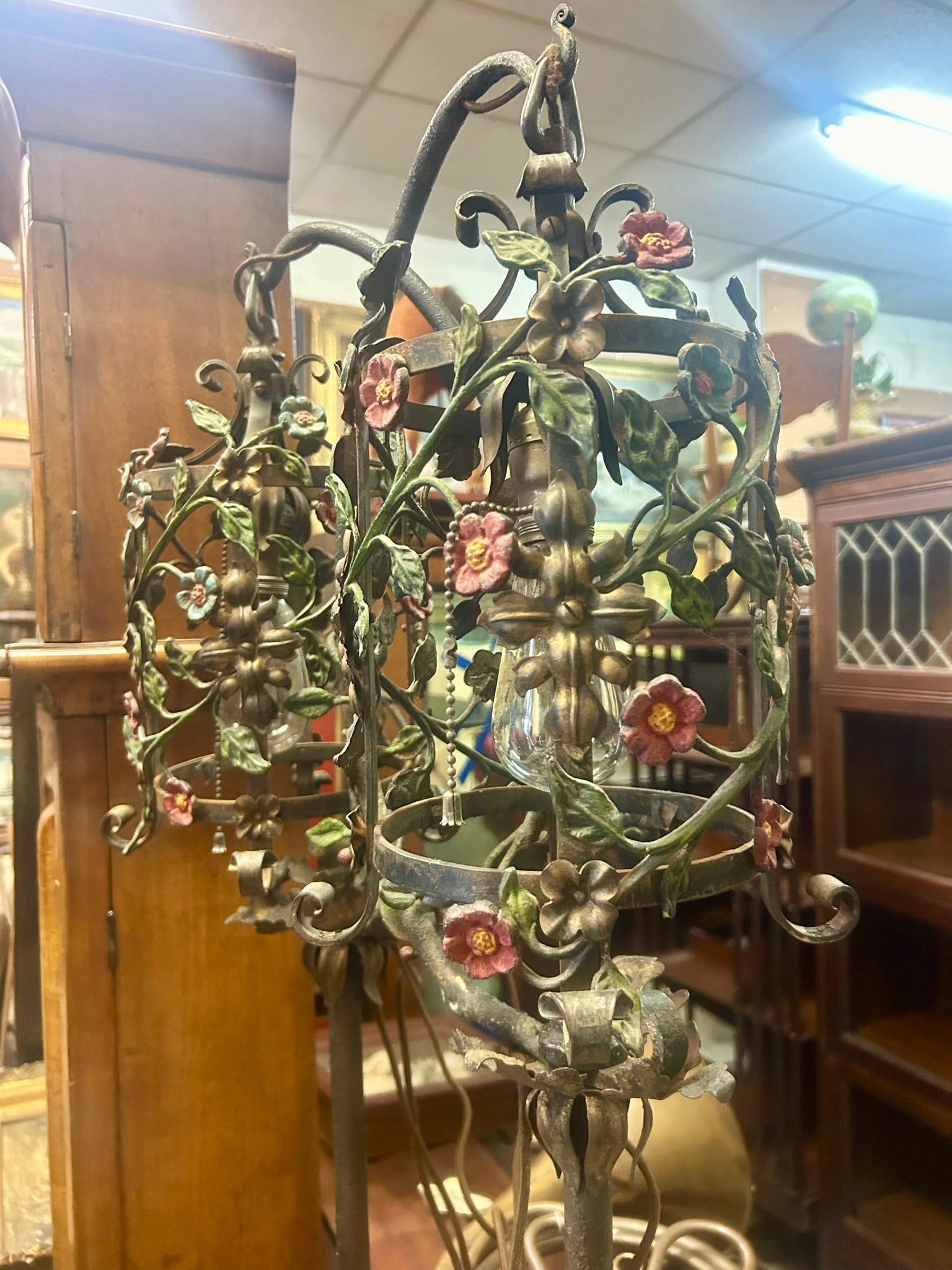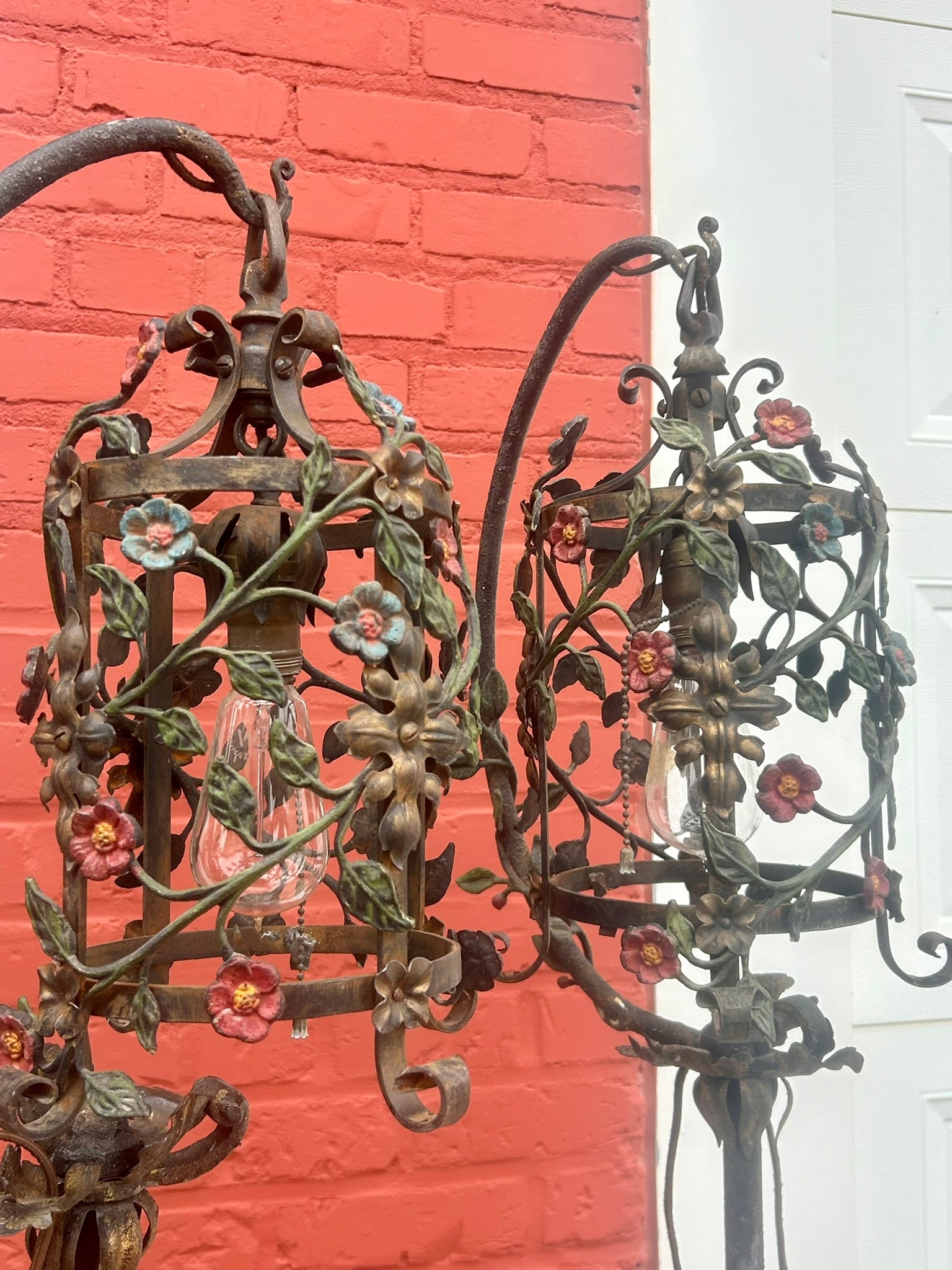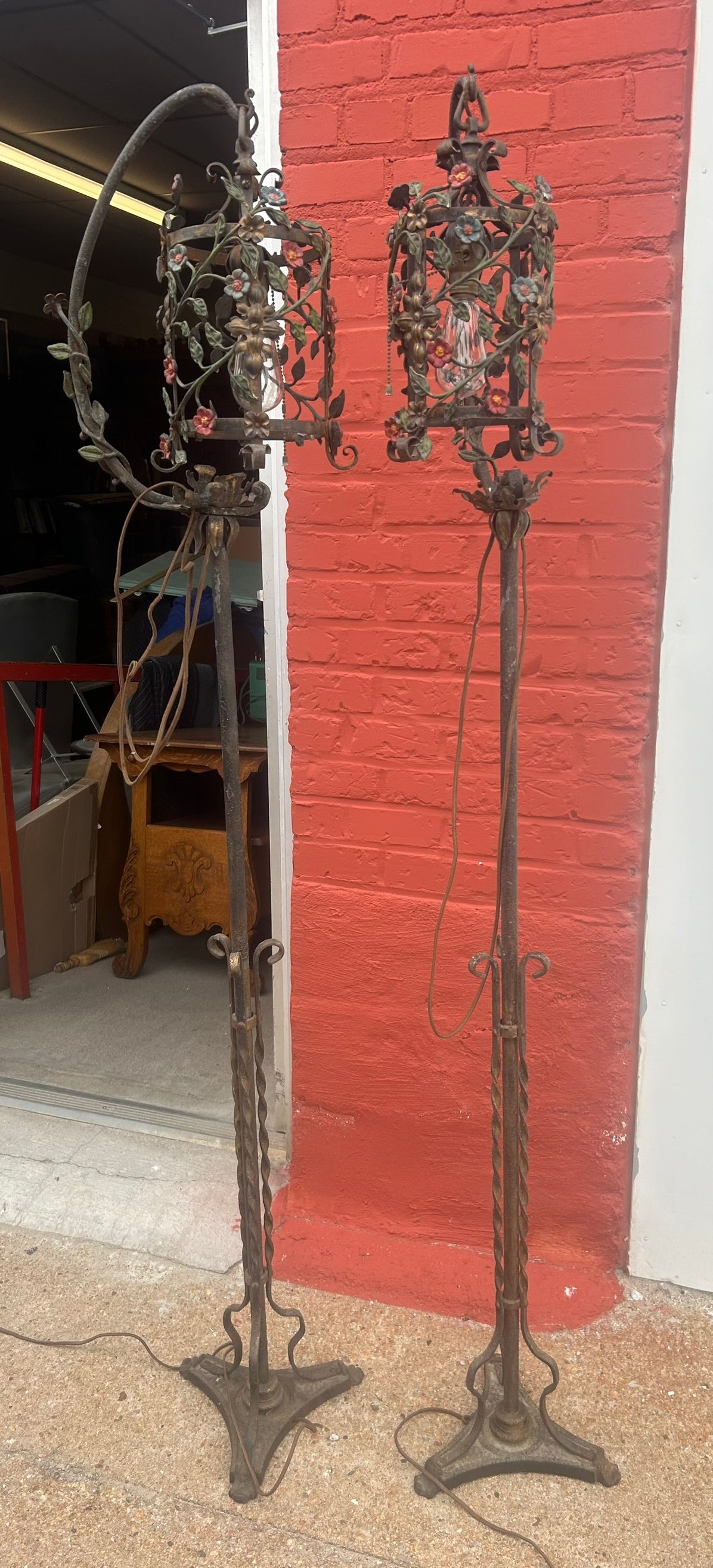 WROUGHT IRON DECO FLOOR LAMPS WITH FLOWERS PAIR